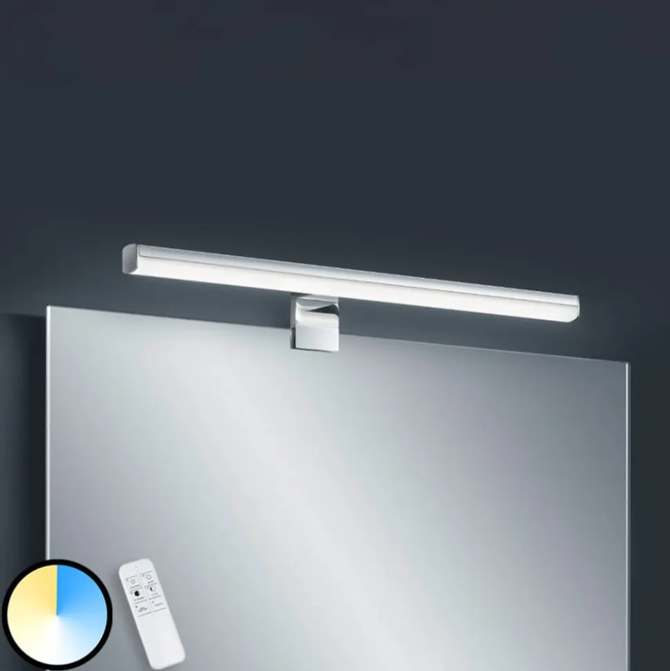 LED-spejl og væglampe Gaia i skinnende krom med fjernbetjening til nem justering af lysets temperatur og lysstyrke.