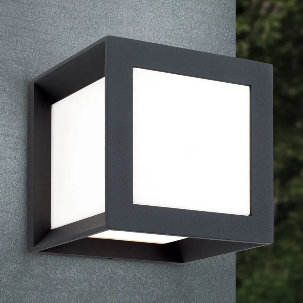 Terningformet udendørs væglampe Henry med lysfordeling til alle sider Denne udendørs væglampe kan bruges til at belyse f.eks. husets indgangsparti på en omfattende måde. Den kubeformede ramme af robust trykstøbt aluminium indeholder en opal PMMA-afskærmning, der udsender lyset fra den anvendte lampe blændfrit i alle retninger. Henry-væglampen med IP44-stænkbeskyttelse kan bruges overalt udendørs og kan også installeres som loftslampe. Lysstyrken kan justeres ved hjælp af en ekstern lysdæmper.
