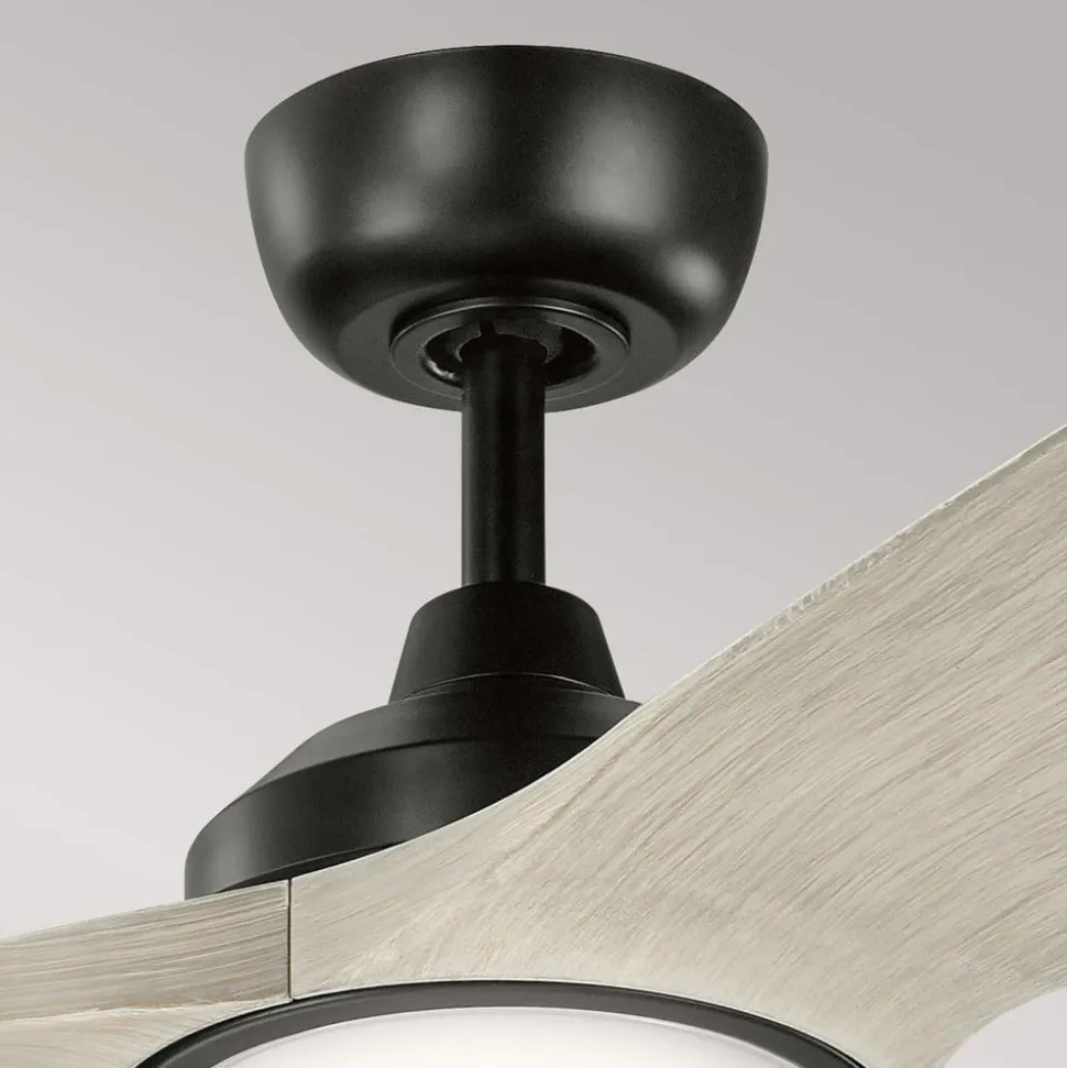 Imari LED-loftventilator, trebladet med LED-lys Imari LED-loftventilatoren imponerer med sit moderne, klare look, som den opnår takket være farvekombinationen af sort ramme og blade i hvidt valnøddelook samt det trebladede design. LED-lyset, der er integreret i bunden af ventilatoren, giver en varm hvid belysning, som også kan dæmpes med den medfølgende fjernbetjening. Funktioner Ventilatoren kan indstilles til seks hastigheder med den medfølgende fjernbetjening. Den kan monteres på lofter med en maksimal taghældning på 30°. Den indbyggede LED-lampe giver et varmt hvidt lys, hvis lysstyrke nemt kan dæmpes trinløst ved hjælp af fjernbetjeningen. Tekniske data – 6 hastigheder: min. 54 o/min, maks. 131 o/min – 27,3 W – DC-motor – Cirkuleret luftstrøm 268,39 m³ maks, 110,58 m³ min – Støjniveau 47,3 dB