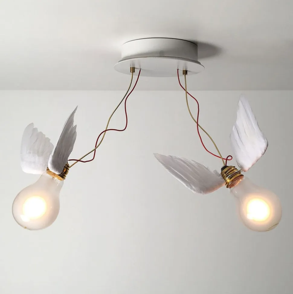 Med Lucellino-serien er det lykkedes designeren Ingo Maurer at skabe imponerende lamper med en vingeeffekt. Lucellino Doppio er udstyret med LED-lamper med gåsefjer. De er fastholdt af tynde ledninger på den runde baldakin og giver indtryk af, at de straks vil flyve væk som to små fugle.