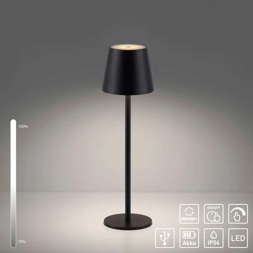 Euria mobil LED-bordlampe til indendørs og udendørs brug – justerbar lysstyrke Euria er en klassisk formet bordlampe med en rund fod og lampeskærm med kegleform. Sidstnævnte huser det varmhvide LED-modul, hvis lys udsendes blidt opad og nedad og kan tændes og dæmpes ved hjælp af en berøringsdæmper på toppen. Det stænktætte design og det genopladelige batteri gør Euria til en fleksibel ekstra lyskilde til stuen, terrassen og haven – Stellet kan justeres i højden under installationen – Kapslingsgrad: IP54 – Opladningstid: 4 timer – Brændetid ved høj lysstyrke: 6 timer