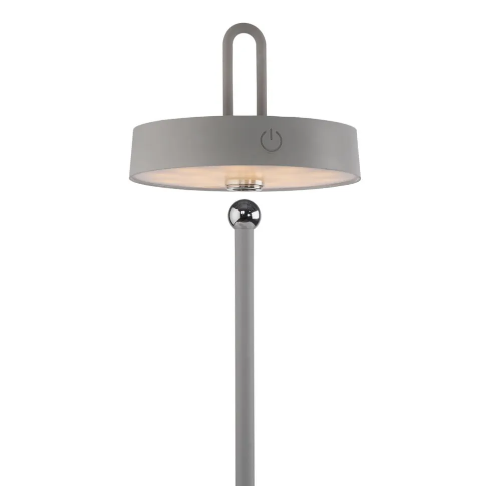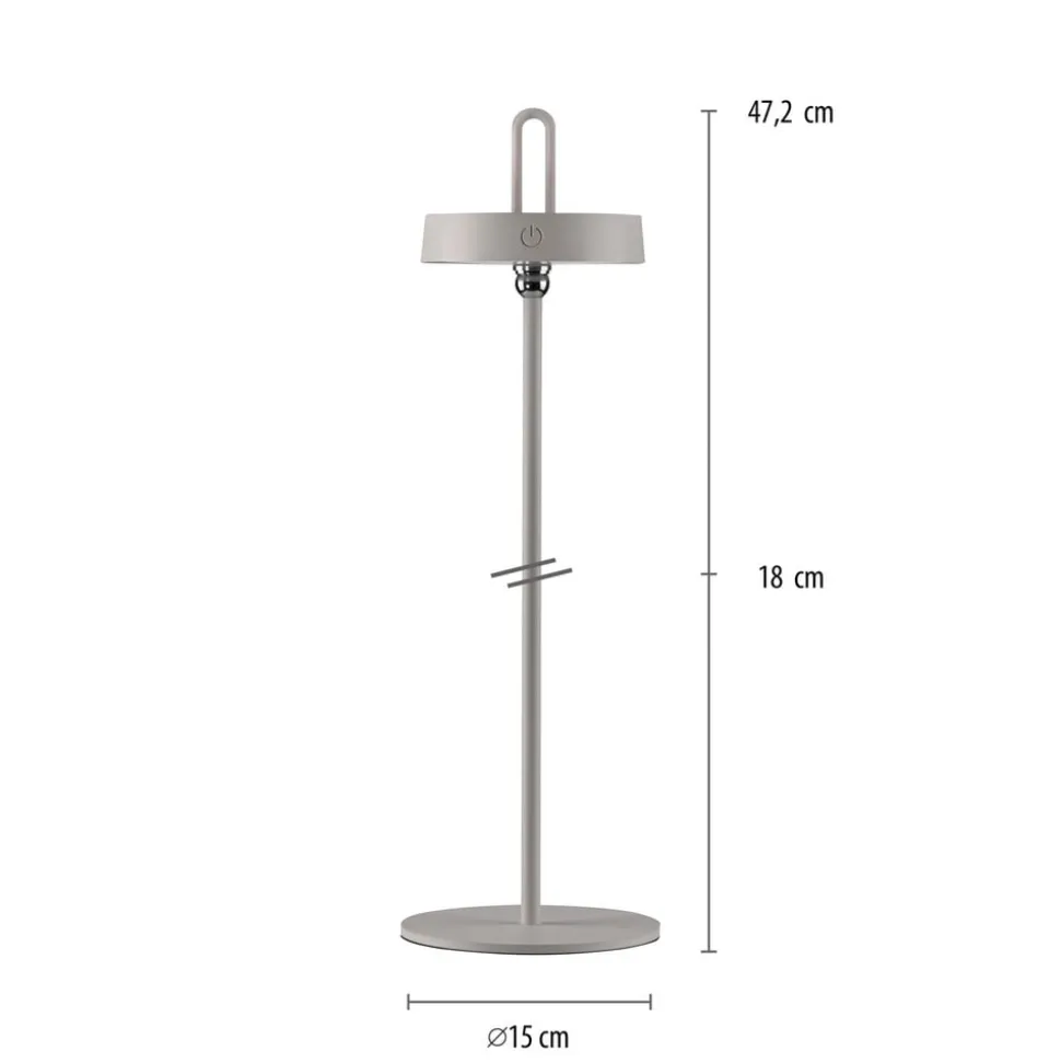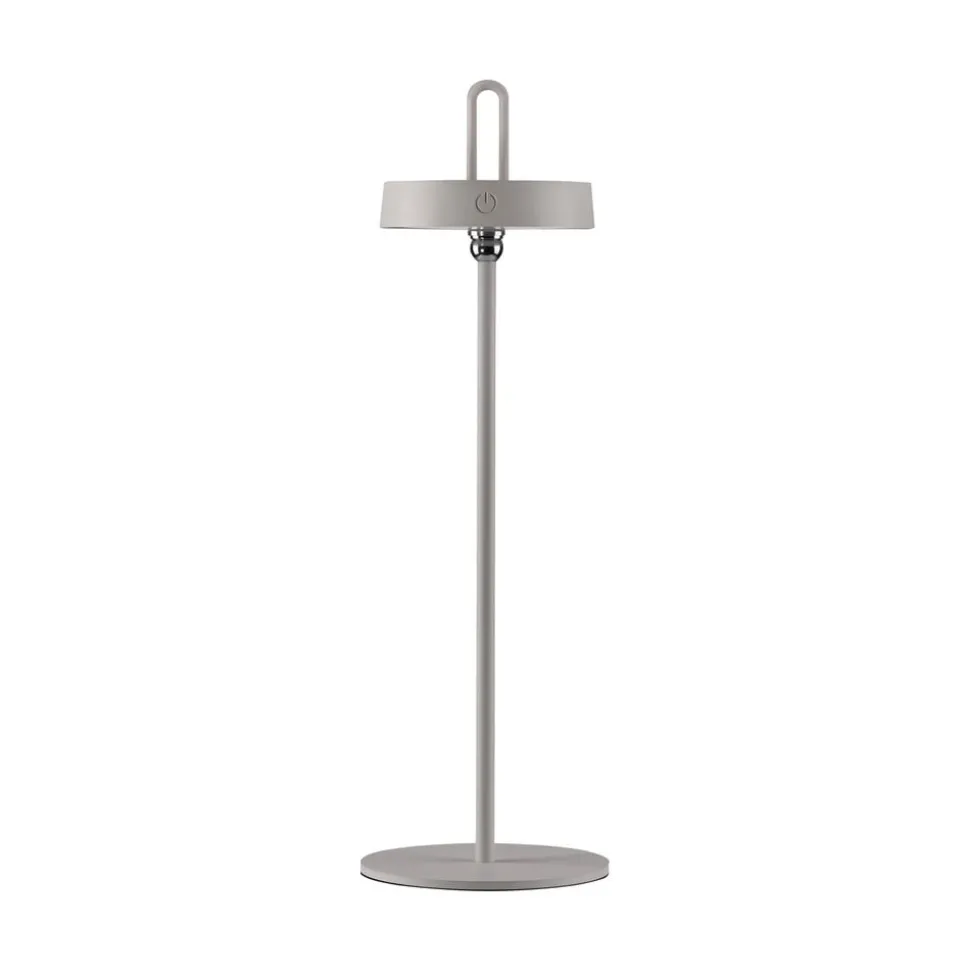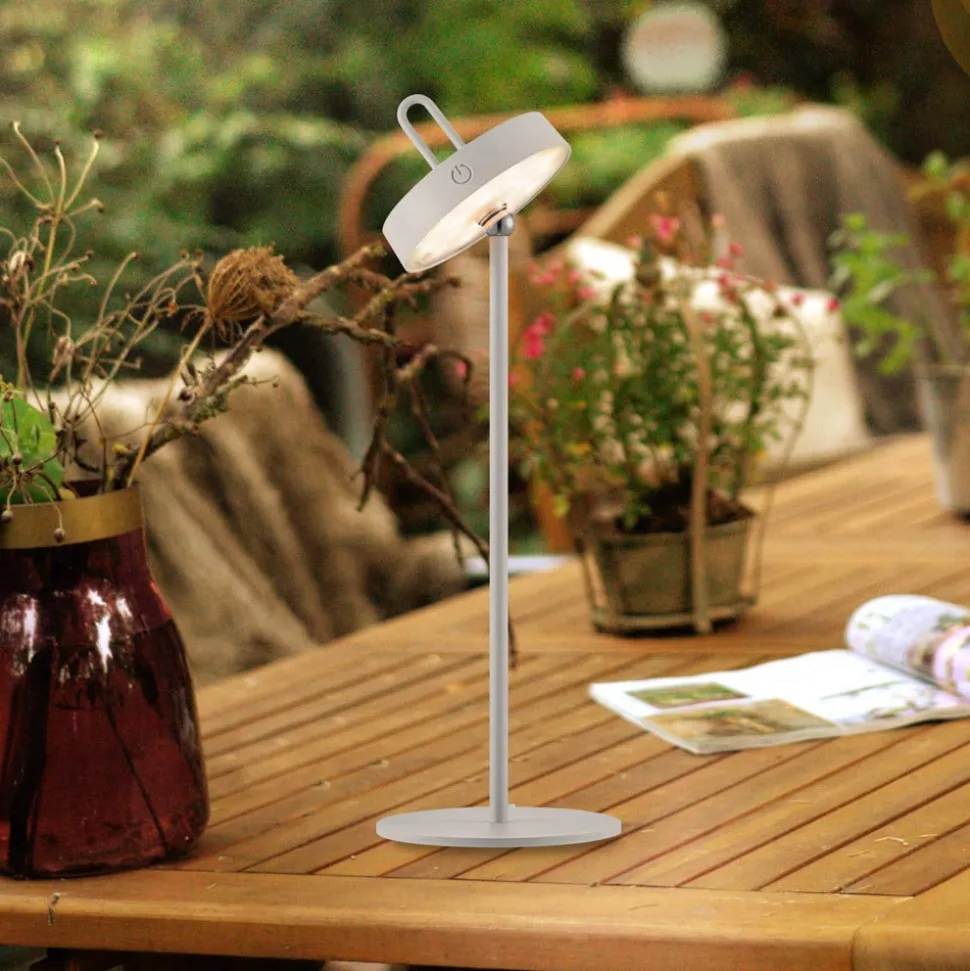 Amag mobil LED-bordlampe med justerbart hoved Amag LED-bordlampen af metal er en moderne og fleksibel ekstra lyskilde. Det runde hoved kan vippes hele vejen rundt takket være et kugleled. Det integrerede LED-spotlight skinner nedad og tændes og dæmper ved hjælp af knappen på siden af hovedet. Udstyret med et genopladeligt batteri kan Amag betjenes uden strømtilslutning og er også det ideelle HighLight til haven og terrassen takket være sin stænkbeskyttelse – Kapslingsgrad: IP44 – Opladningstid: 4 timer – Brændetid ved høj lysstyrke: 7 timer