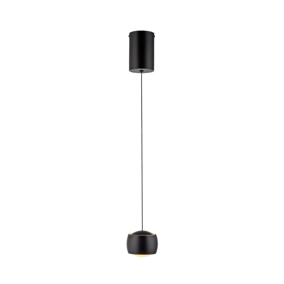 Den sorte LED-hængelampe Ballini med 1 lyskilde er udstyret med en kugle i den ringformede lampeskærm, som er uigennemsigtig i sort i den øverste del, mens lyset stråler homogent nedad gennem det opalhvide materiale. En lille del af lyset stråler desuden opad gennem den smalle ringformede lysudgang.