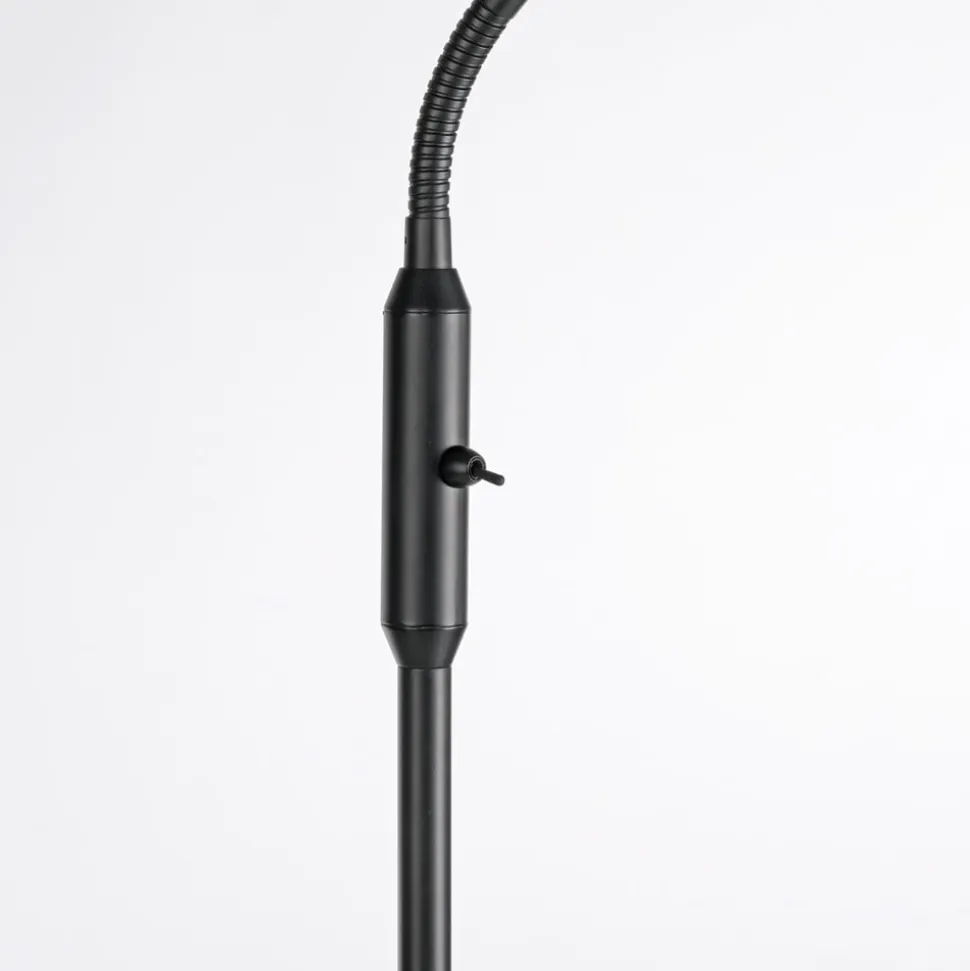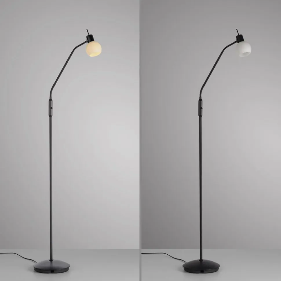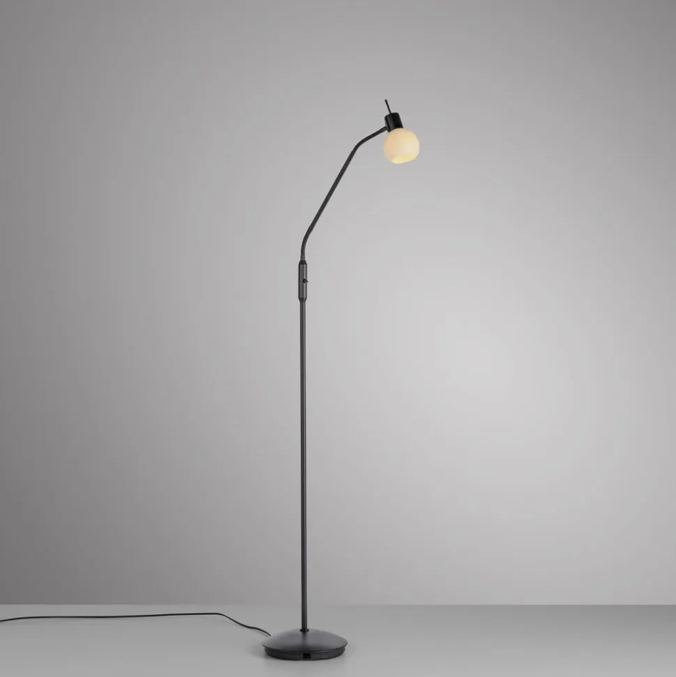 Loki bordlampe af jern og glas med E14 LED-pære Loki er en slank gulvlampe med et sortlakeret jernstel og en næsten sfærisk glasskærm. Den er perfekt som læselampe i stuen og kan orienteres efter behov takket være de to fleksible sektioner i den øverste tredjedel af stellet. Den delikate gulvlampe med en næsten sfærisk, satineret skærm leveres med en LED-gulvlampe med E14-sokkel og varmhvid lysfarve og er udstyret med en kontakt på stellet.