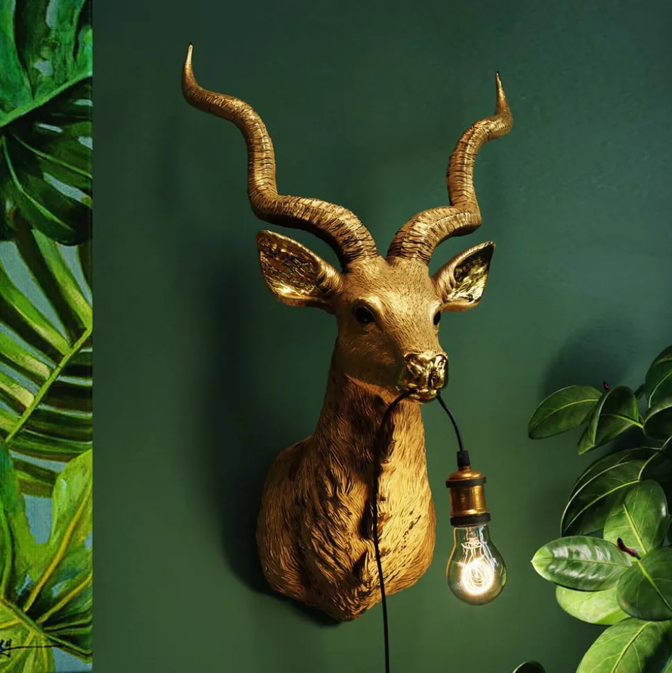 Animal Goat væglampe i guldfarvet polyresin Et hjemligt hjem har brug for dekorativt tilbehør og lamper. De fungerer som smykker, der gør indretningen af et rum perfekt. Animal Goat-væglampen kombinerer charmen ved et kreativt vægdekorationsobjekt med fordelene ved en stemningsfuld lampe. Desuden er antilopehovedet den dyrevenlige version af et trofæ – lavet udelukkende af syntetisk harpiks og malet i guld. En anden fordel ved denne væglampe: Den er udstyret med et kabel med stik og afbryder, så der ikke er behov for vægtilslutning – en stikkontakt i nærheden er nok. En dekorativ glødelampe anbefales som lyskilde.