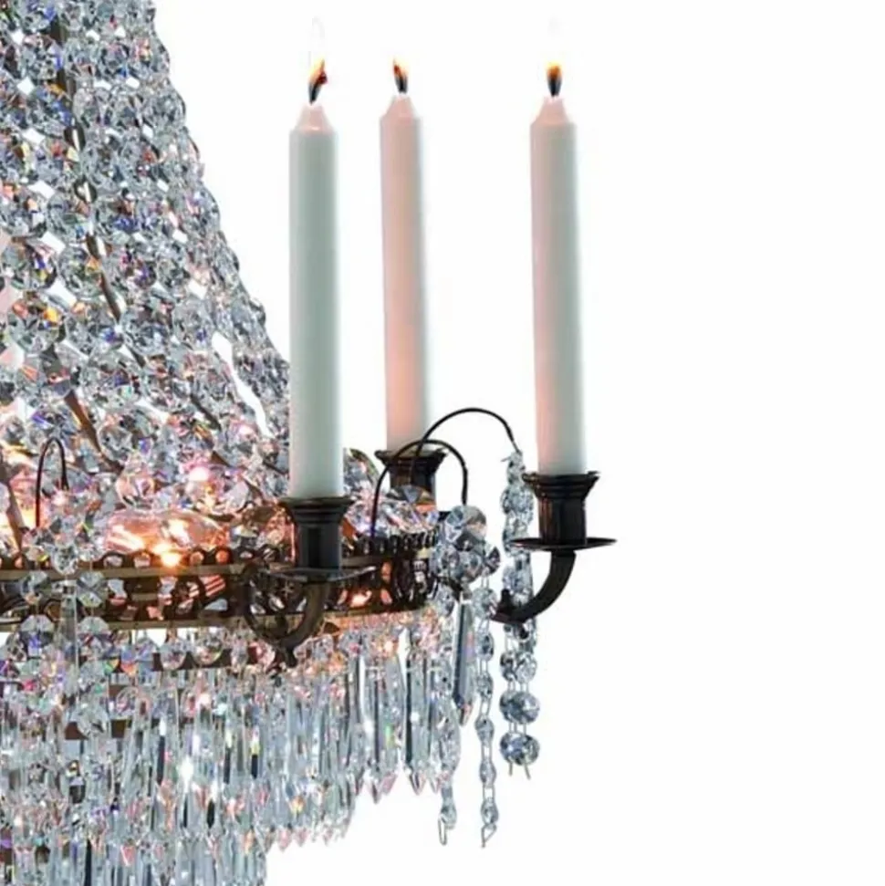 Denne lysekrone til levende lys er et sandt smykke. Metalrammen fås i forskellige størrelser og giver lampen sit klassiske design. Utallige krystaller forædler lysekronens fremtoning og er desuden ansvarlige for glansfulde belysningseffekter. Den imponerende fremtoning afrundes yderligere med lysestager, hvori de slanke lys sørger for en harmonisk udligning. Denne lysekrone fortryller ethvert rum, også når den er slukket, og den er et vidunderligt blikfang.