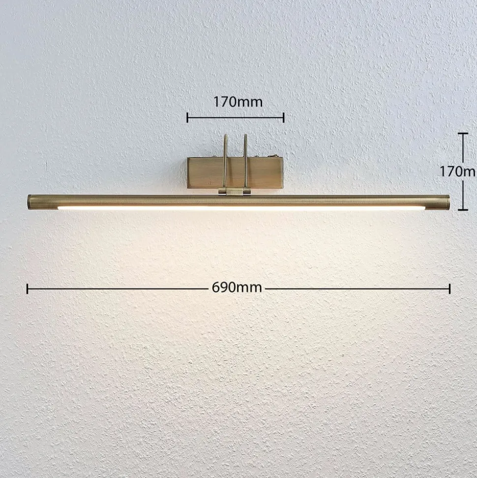 Buet LED-gallerilampe Mailine med nedadrettet lys og en metaloverflade i patineret messing