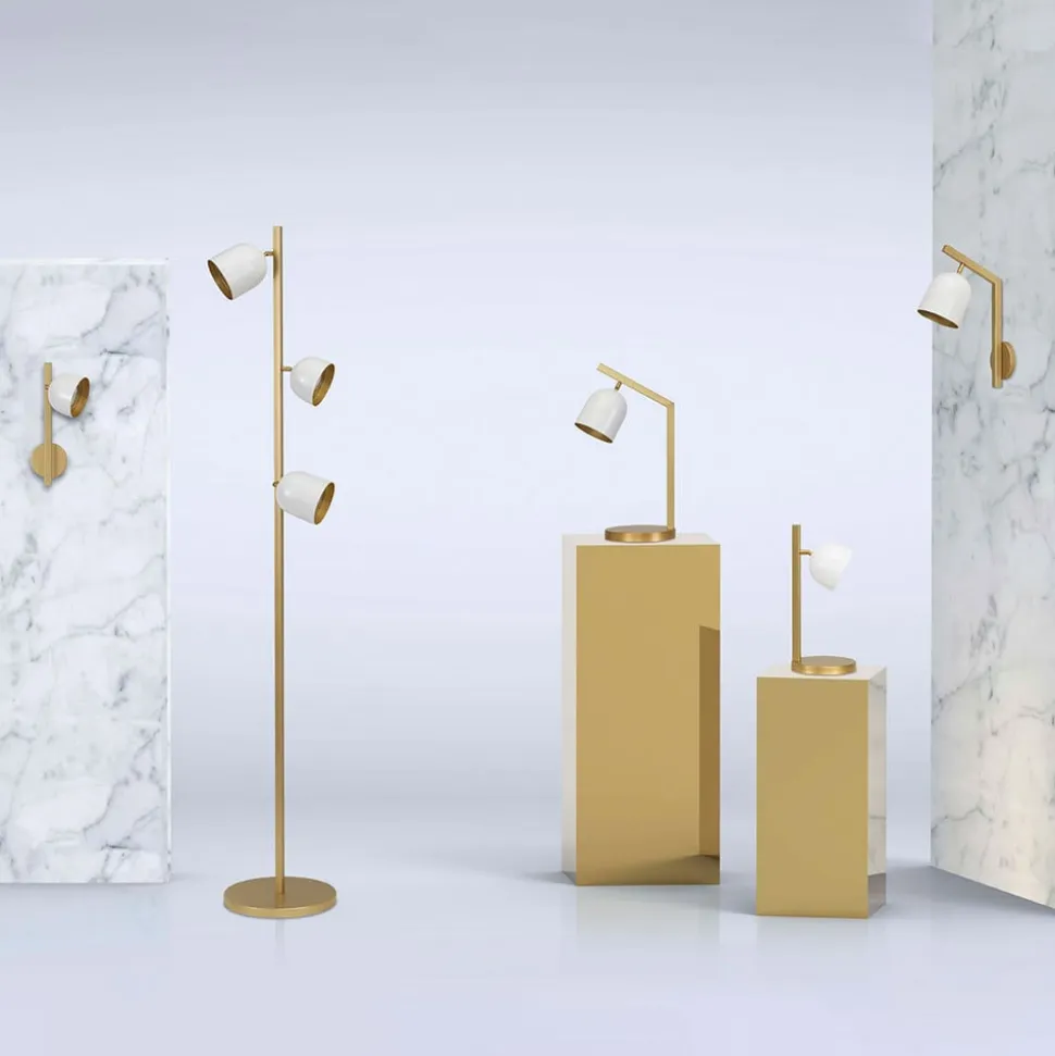 Imponerende Dome LED-gulvlampe med tre skærme Takket være sin størrelse er Dome LED-gulvlampen en iøjnefaldende lyskilde i moderne og sofistikerede opholds- og loungeområder. De kuppelformede skærme i forskellige størrelser er forskudt i den øverste del af det firkantede stativ. Da skærmene kan drejes og svinges og også har optiske linser, kan lysudbyttet styres efter behov. Den dominerende gyldne finish sikrer et elegant look i høj kvalitet.
