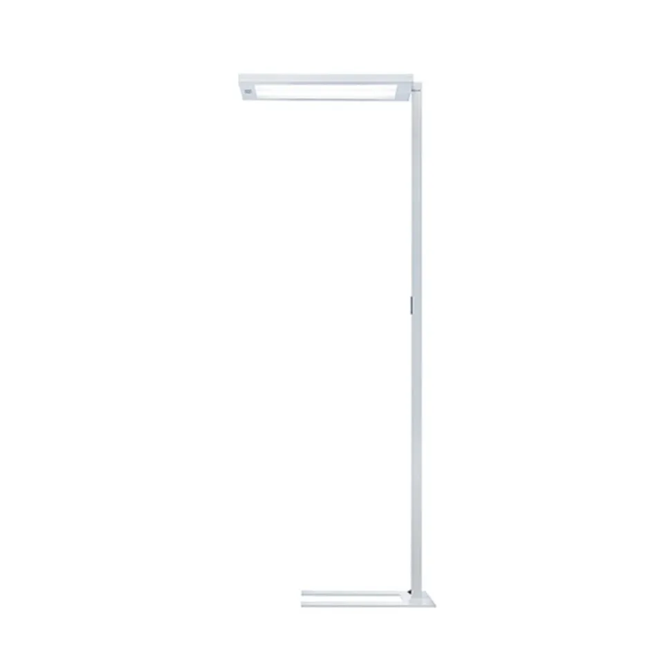Lavigo DPS 14000/840/R/G2 LED-stativarmatur til kontorer Lavigo-stativarmaturet med multifunktionel trykknap og aftageligt armaturhoved er den perfekte lyskilde til kontorer og computerarbejdspladser takket være den fremragende afblænding. Dette sikres af den koniske prismeafskærmning samt Edgelight- og Lightguide-teknologien, der giver en homogen lysudsendelse af det direkte lys. Det fritstående armatur udsender absolut flimmerfrit lys og er udstyret med en passiv infrarød bevægelsessensor og en dagslyssensor, så lyset tændes og slukkes automatisk. Det direkte og indirekte lys kan justeres individuelt og separat ved hjælp af den multifunktionelle trykknap på armaturets standerrør. Det meste af lyset udsendes opad, så Lavigo fungerer som en loftslampe. Den flade armaturfod gør det også muligt at placere armaturet under et skrivebord. – Blændingskontrol: UGR < 10 – Lysfordeling: 12% direkte, 88% indirekte