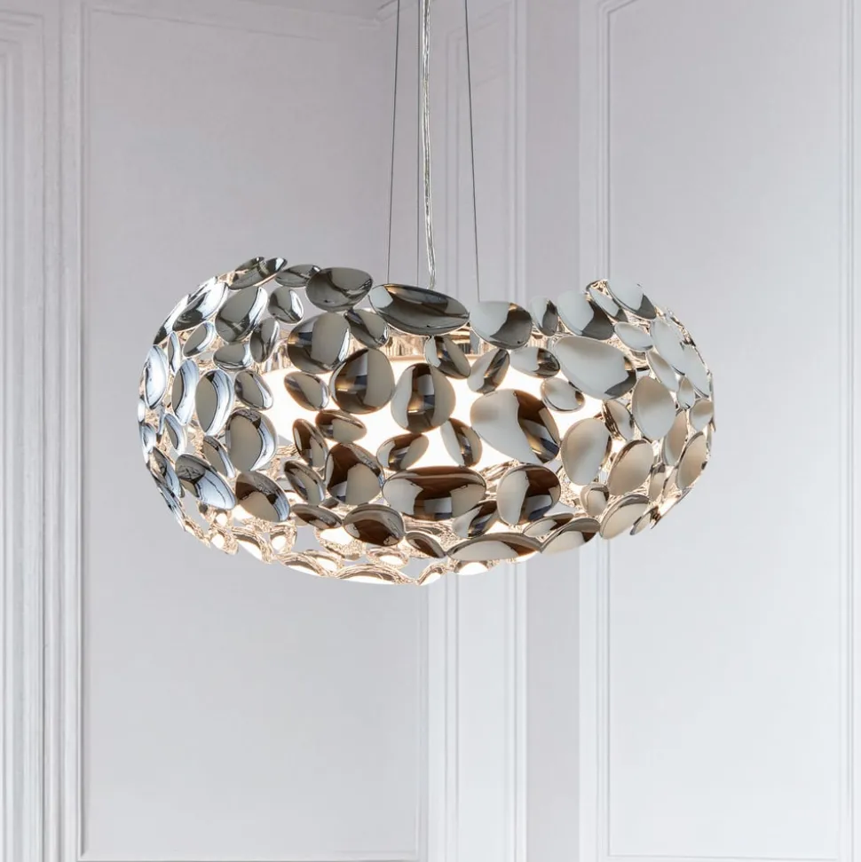 Uregelmæssigt formede, hovedsageligt ovale metalelementer med forkromet overflade er hos LED-hængelampen Narisa placeret efter hinanden på række for at danne en usædvanligt formet lampeskærm. På den måde opstår der en fortryllende konstruktion, der – i lige gyldigt hvilket rum – bliver til midtpunktet. Pærerne sidder bag en diffusor af hvid akryl. Dermed formår de at afgive et jævnt fordelt lys nedad, mens de utallige mellemrum i skærmen og spejlingerne af lyset i de bølgende elementer hele vejen rundt får flotte lyseffekter til at opstå på vægge og indretningsgenstande.