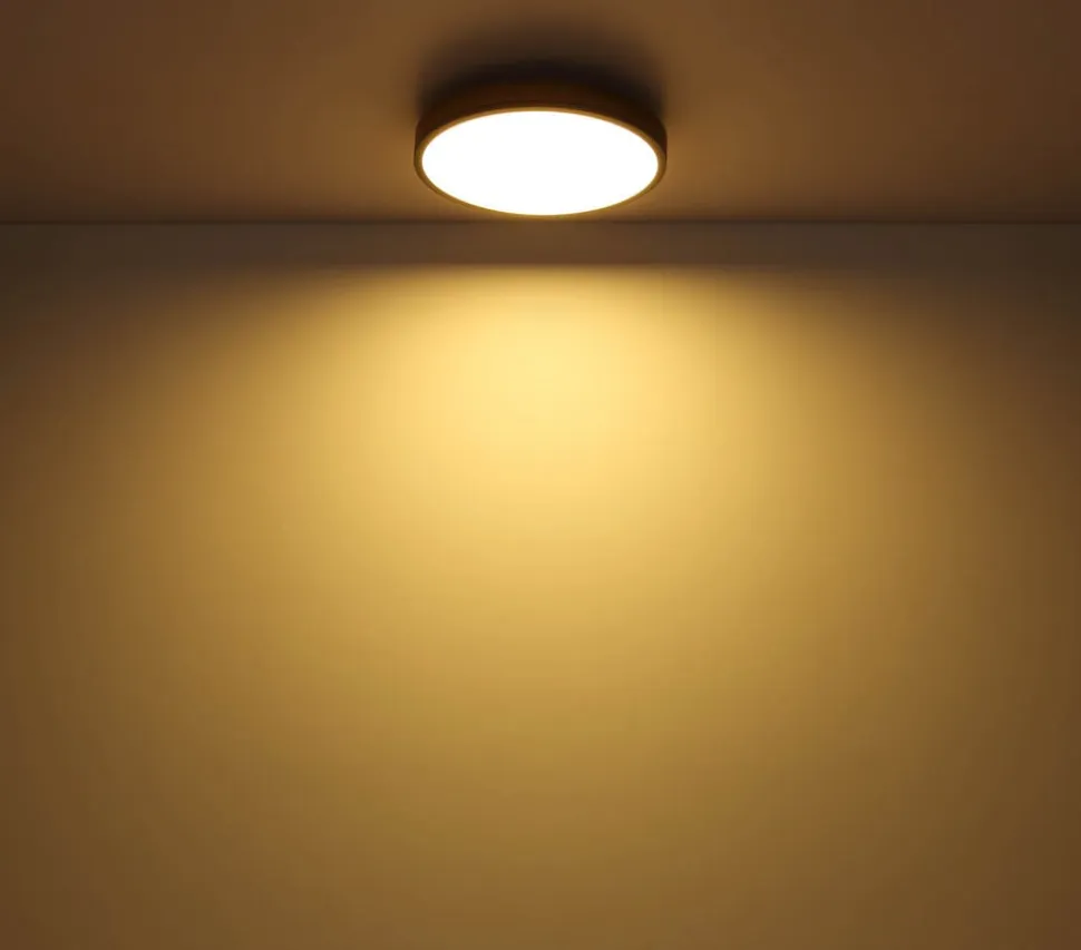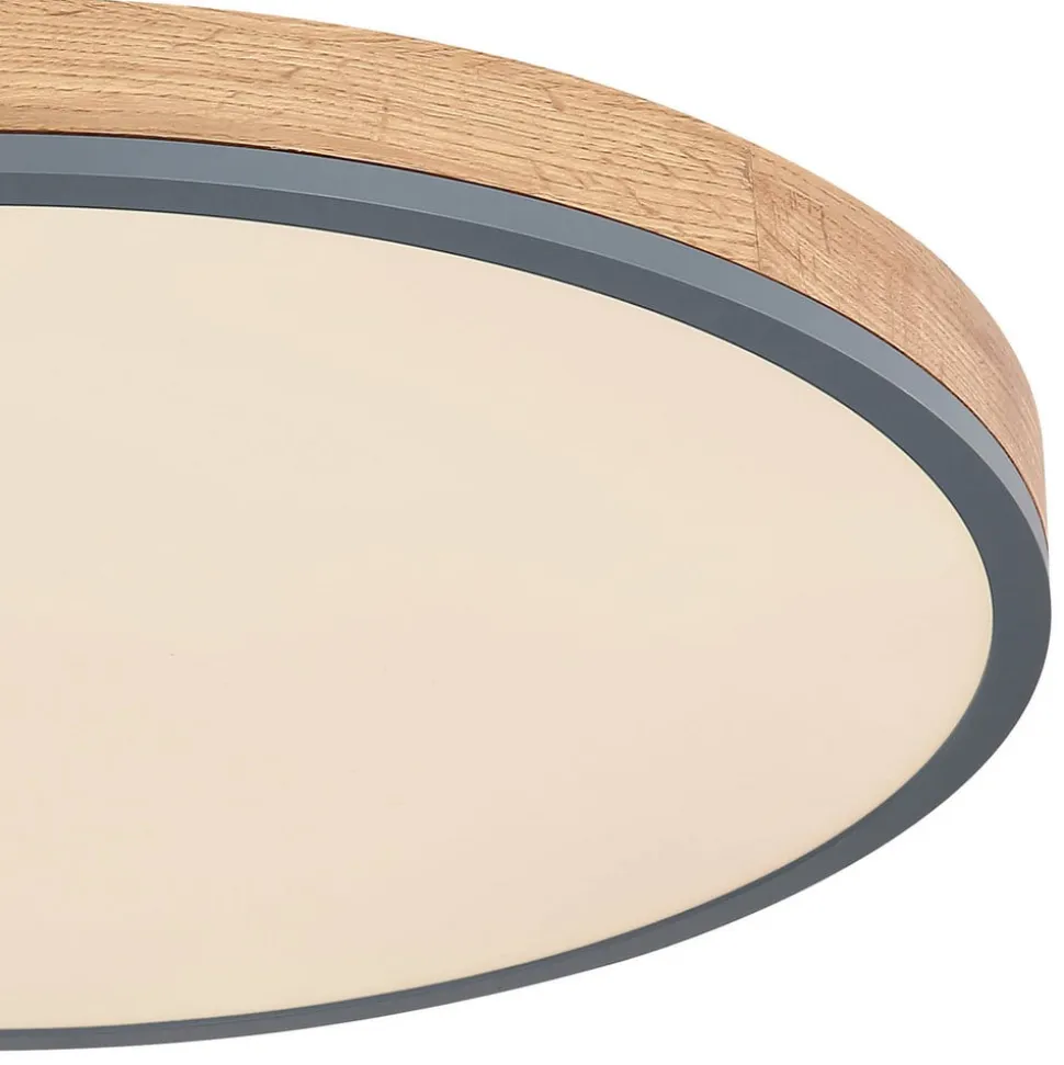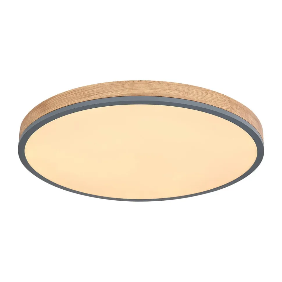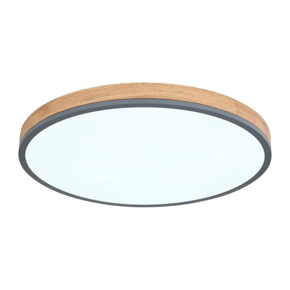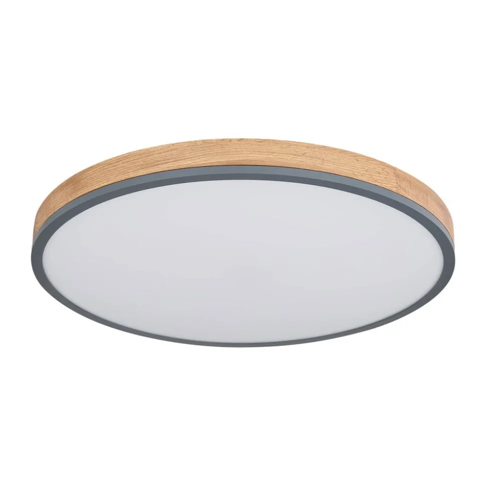 Doro LED-loftlampe med kontrollerbar lysfarve (CCT) Den runde Doro-loftlampe imponerer med sit moderne design. Den opalfarvede plast, der dækker de indbyggede LED-pærer, sikrer et blændfrit lys. Kabinettet af grafitfarvet malet metal og mørkt MDF-træ tilfører en hjemlig nuance til ethvert rum. Lysfarven kan justeres trinløst (varmhvid til dagslys). Udstyret med natlysfunktion og timer. Kan betjenes via den medfølgende fjernbetjening (inkl. to AAA-batterier) eller via den eksterne vægkontakt – Integreret hukommelsesfunktion