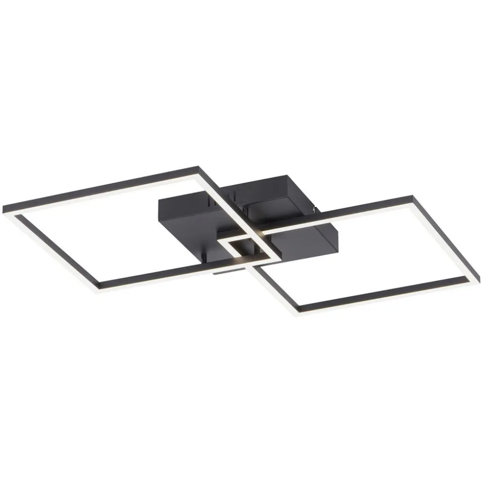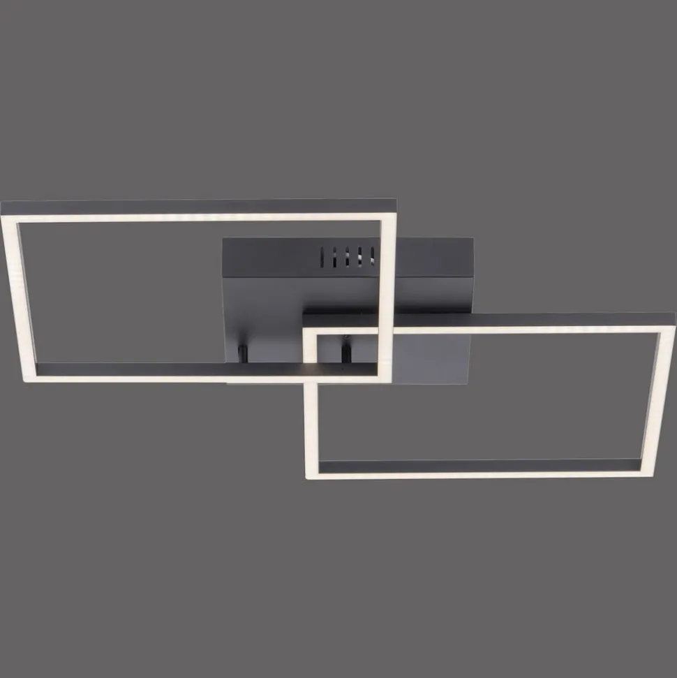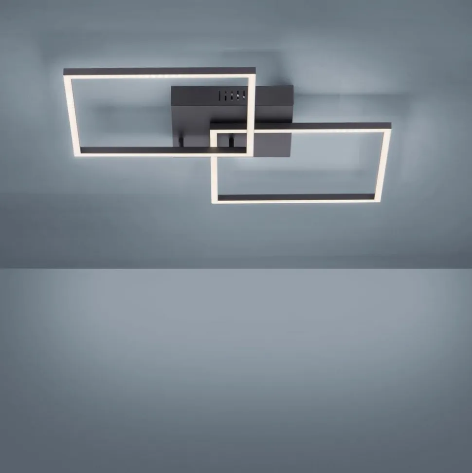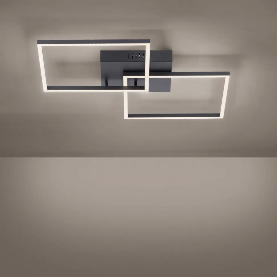 LED-loftlampe Iven er udstyret med to firkantede rammer og sikrer med sine lysstærke og energibesparende LED’er tilstrækkelig belysning i alle rum. De to firkanter er monteret forskudt over hinanden og overlapper hinanden i et hjørne. Lyset spotlight nedad mod gulvet over hele rammen. Iven er velegnet til både entreen og stuen, da de mulige anvendelsesområder er meget brede takket være de justerbare funktioner. Ved hjælp af den medfølgende infrarøde fjernbetjening kan lysfarven indstilles efter ønske mellem varmhvid og universalhvid. Lysstyrken kan også dæmpes trinløst, så man på få sekunder kan forvandle en arbejdsatmosfære til en hyggelig stemning.