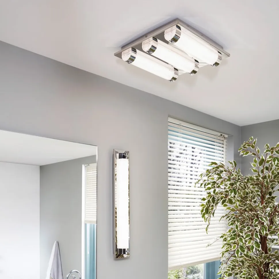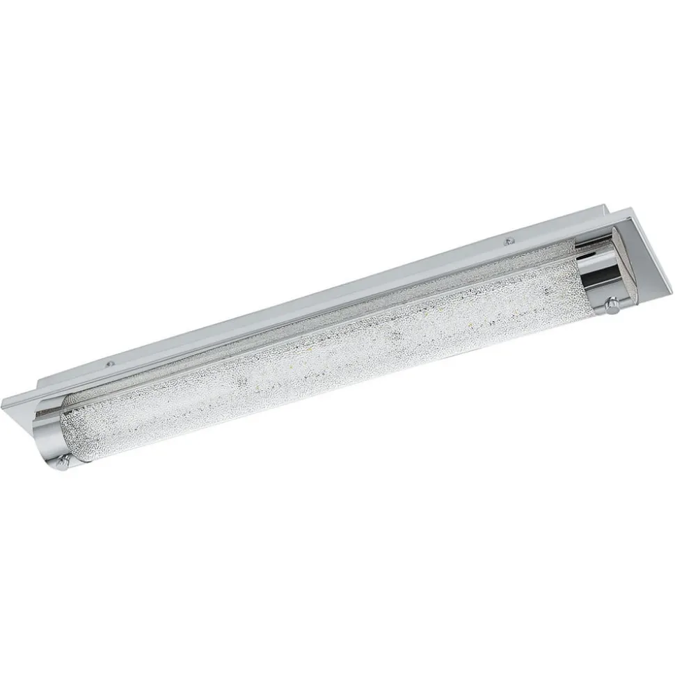 På det rektangulære loftelement af rustfrit stål er der på LED-loftlampen Tolorico monteret et klart glasrør, som er designet med en funklende krystaleffekt på indersiden og holdes på siden af to forkromede ringe. Det ædle udseende og den funklende lyseffekt gør armaturet til et eksklusivt belysningselement, uanset om det er monteret som loftsarmatur eller vægarmatur. Med IP44-beskyttelse mod stænkvand er armaturet også velegnet til brug på badeværelset.