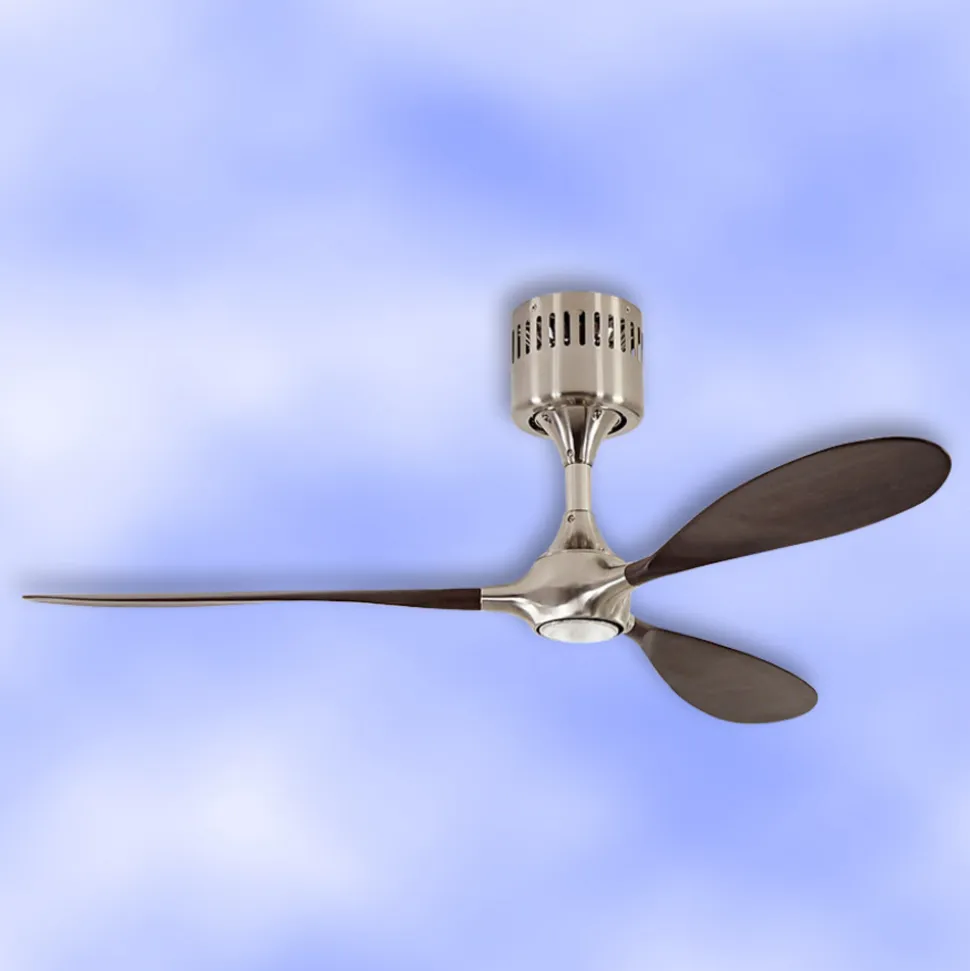 Tre slanke vinger i padleform giver denne loftventilator sit karakteristiske udseende. De tre vinger er fremstillet af massivt træ og suppleres af et hus i børstet kromlook. Fjernbetjening og vægbeslag medfølger. En dæmpbar E27 LED-pære medfølger.