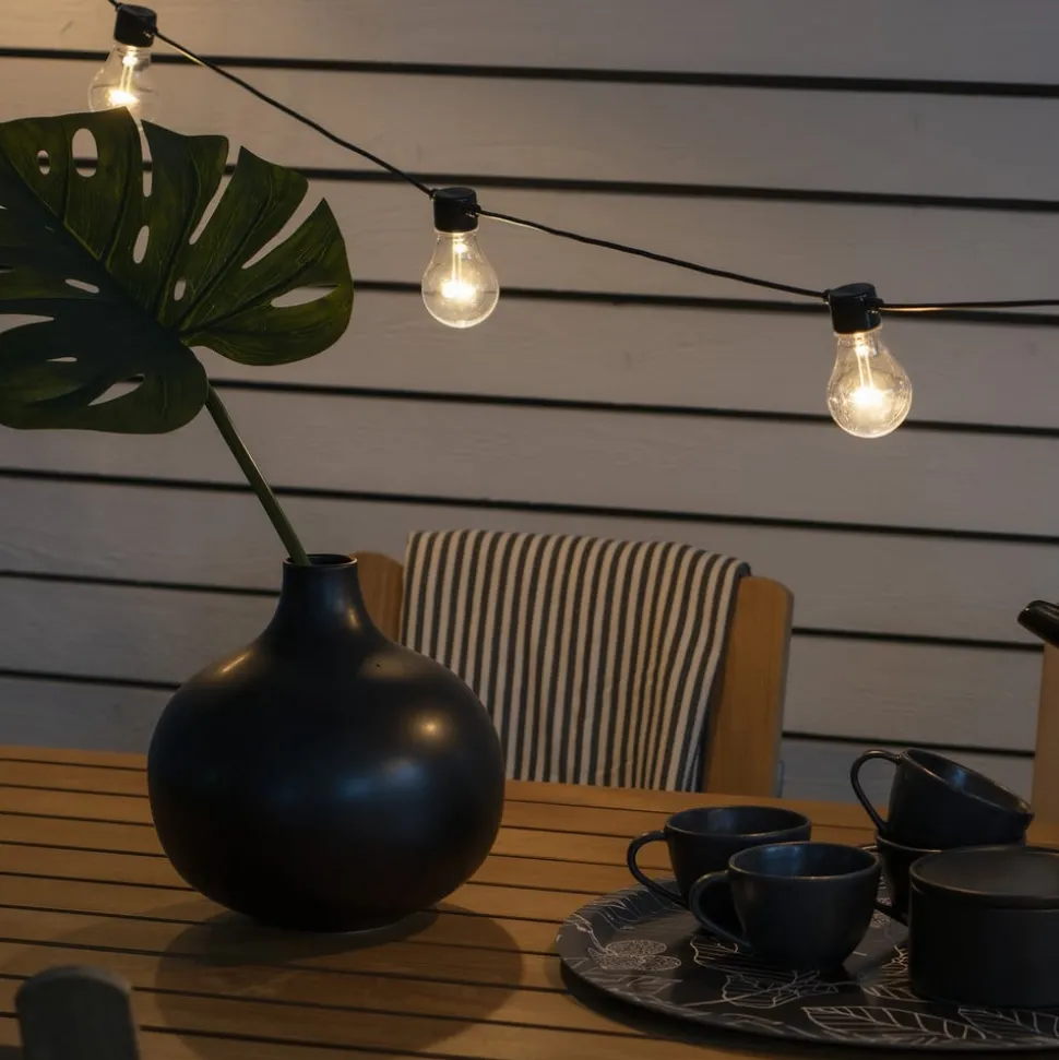 Basissæt af LED-lyskæder til ølhaven med ravfarvede LED’er, der kan udvides De dekorative LED-lyskæder til ølhaven giver et meget blødt, ravfarvet lys. De moderne LED’er i de klare pærer giver en behagelig udendørs belysning. Uanset om det er på haveskuret, terrassen eller altanen, kan basissættet med ølhavelys installeres næsten hvor som helst. Basen kan udvides med op til tre forlængere, hvilket giver en maksimal samlet længde på 50 meter og 40 pærer. Så intet står i vejen for din næste havefest, uanset om den er lille eller stor. Passende forlængere fås i tilbehøret – Lysudbyttet kan justeres på transformeren