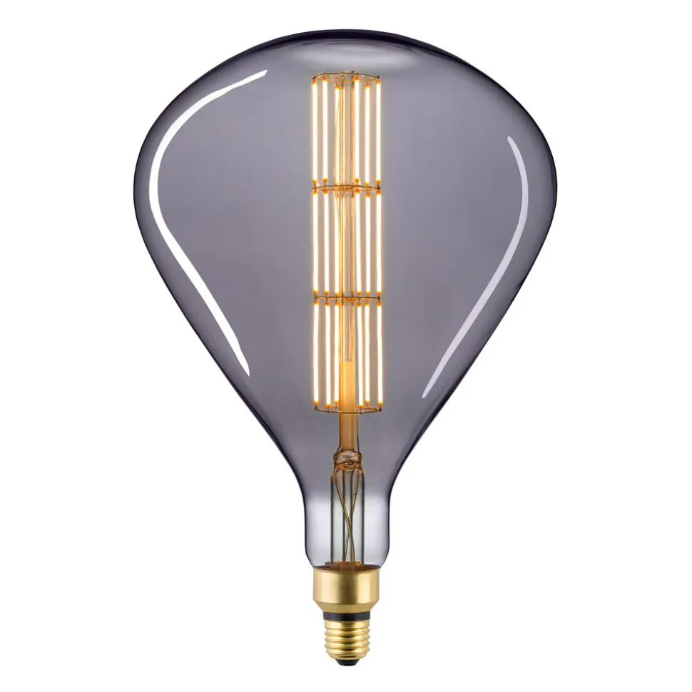 Elegance i lampeform: E27 LED-lampe Giant Tear Filament 8W, titangråtonet, 2.200 Kelvin, dæmpbar, Ra90 LED-lampen Giant Tear med E27-sokkel er imponerende i kraft af sin imponerende størrelse og sin kunstnerisk designede dråbeform. De mange små filamenter, der er arrangeret i en cirkel på tre niveauer, er synlige gennem det titaniumgråtonede glas. Det gør Giant Tear til et elegant blikfang, der er særligt velegnet til brug i åbne armaturer med dekorativ karakter og i ekstravagante designerarmaturer. Den integrerede LED-teknologi imponerer med en særlig varm lysfarve (2.200 K), der skaber en behagelig atmosfære, samt en meget god farvegengivelse (CRI>90). Desuden kan denne moderne LED-lampe dæmpes udefra, så der kan skabes endnu mere individuelle lysscener.
