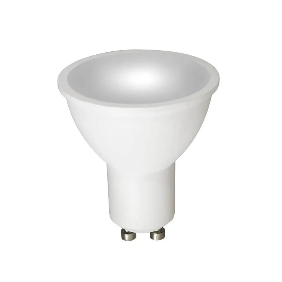 LED-reflektorpære GU10 5 W med bred strålevinkel på 120° Denne LED-reflektorpære udsender lys i en bred vinkel på 120°. Den kan bruges som erstatning for halogenreflektorer med 50 W i eksisterende spotlights. Funktioner/egenskaber – Sammenligningsværdi for halogenpære 50 W – Meget omskiftelig med op til 100.000 omskiftninger – Lang levetid på op til 30.000 timer