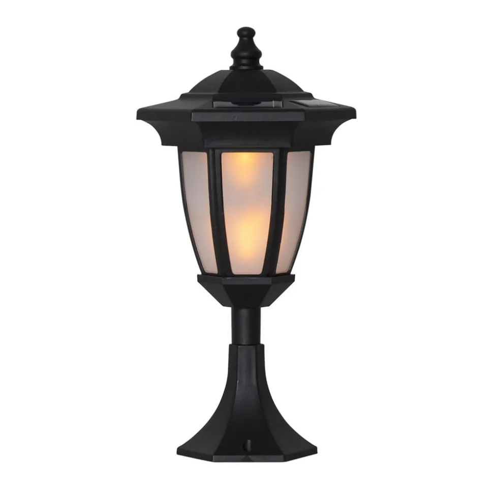 Lanterne til fire formål – Flame LED solcellelampe Lanterneformen på Flame LED solcellelampen til udendørs brug danner grundlaget for dette alsidige system. Lanternen oplyses af en LED, der med sin flimrende funktion ligner en rigtig flamme. På selve lanternen kan der monteres forskelligt tilbehør, som alle er inkluderet i leveringsomfanget: Pakken indeholder et jordspyd, et vægbeslag, en sokkel og en pullert. Lanternen ser derfor ikke kun godt ud, men er også udstyret til alle udendørs behov. Den indbyggede skumringssensor tænder lyset automatisk om aftenen. Det medfølgende batteri oplades i løbet af dagen via solcellemodulet og forsyner lyset med strøm om natten – Ravfarvet lys – Lysvarighed, når batteriet er fuldt opladet: ca. 5 timer – Højde på væglampe og sokkel: 35 cm – Højde på pullertlampe: 63 cm – Højde på jordspyd: 71 cm