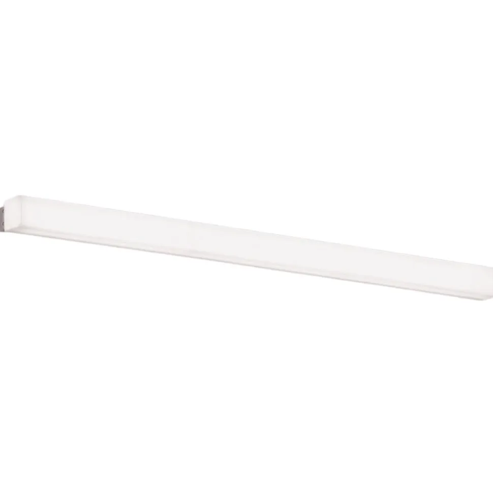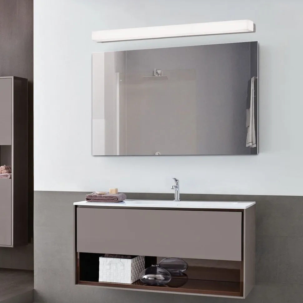 LED-spejllampe passer perfekt over et bredt spejl i badeværelset. Takket være det opale plastikhus, der sidder omkring lysdioderne, udsendes homogent og blændfrit lys ind i rummet. Den sølvvægsmontering skaber en subtil kontrast, der giver lampen en vis elegance. Box er udstyret med indbyggede, varme hvide lysdioder og skaber en naturlig atmosfære.