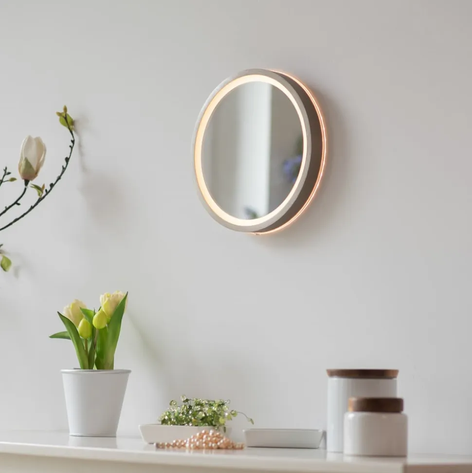 Glasspejlet VIDRO til vægmontering er udstyret med en rund, kontrastfarvet metalramme. Mellem spejlefladen og rammen er der integreret varmhvide LED’er. Lyset fra disse LED’er reflekteres både fremad og bagud mod væggen. Strømforsyningen sker via en medfølgende 5000 mAh powerbank. LED-vægspeglen VIDRO er beregnet til tørre indendørsområder, f.eks. gange, soveværelser og omklædningsrum.