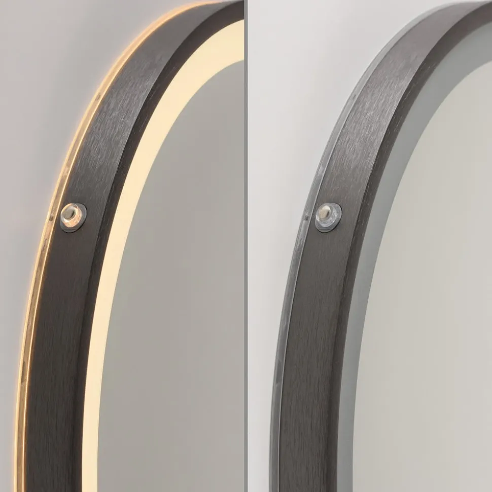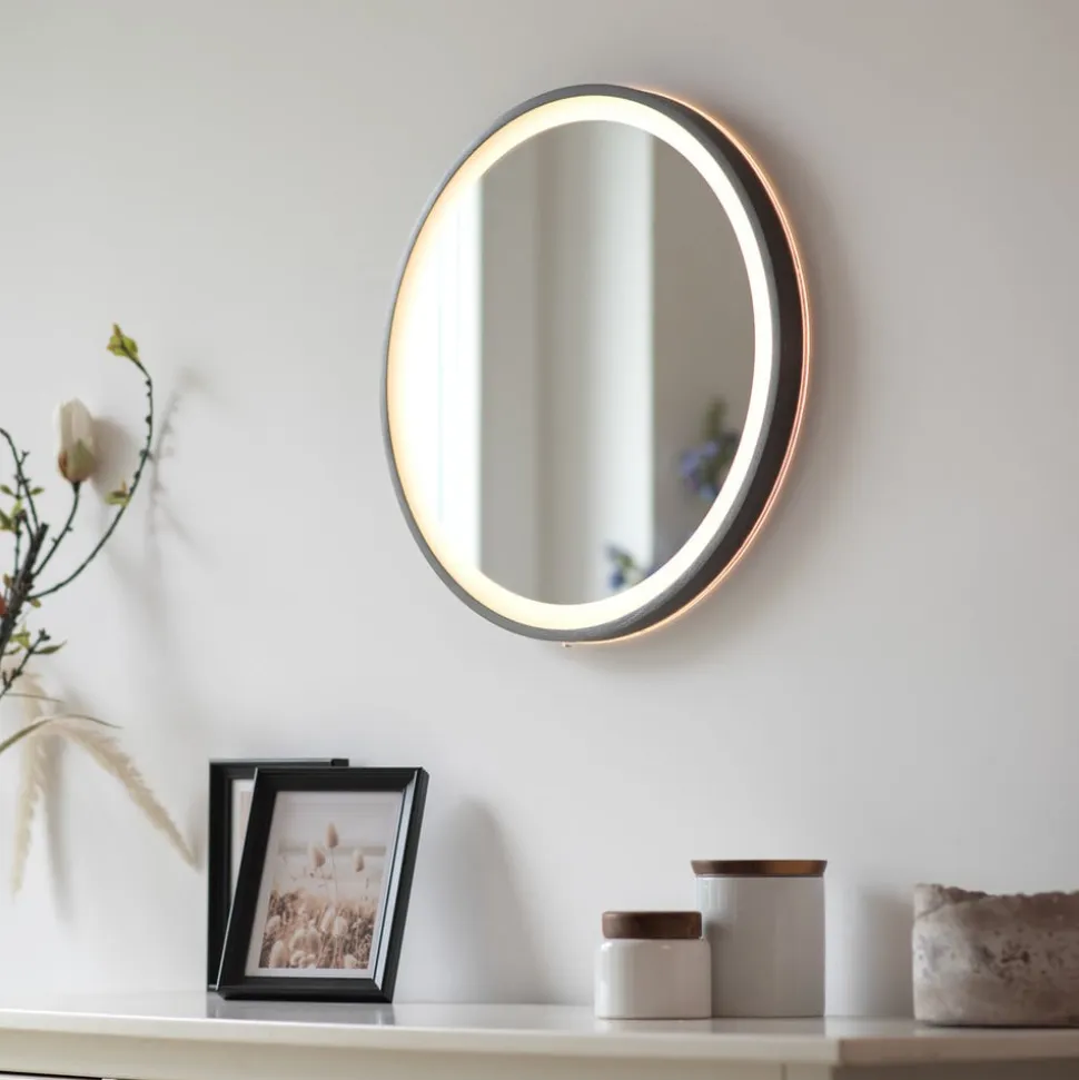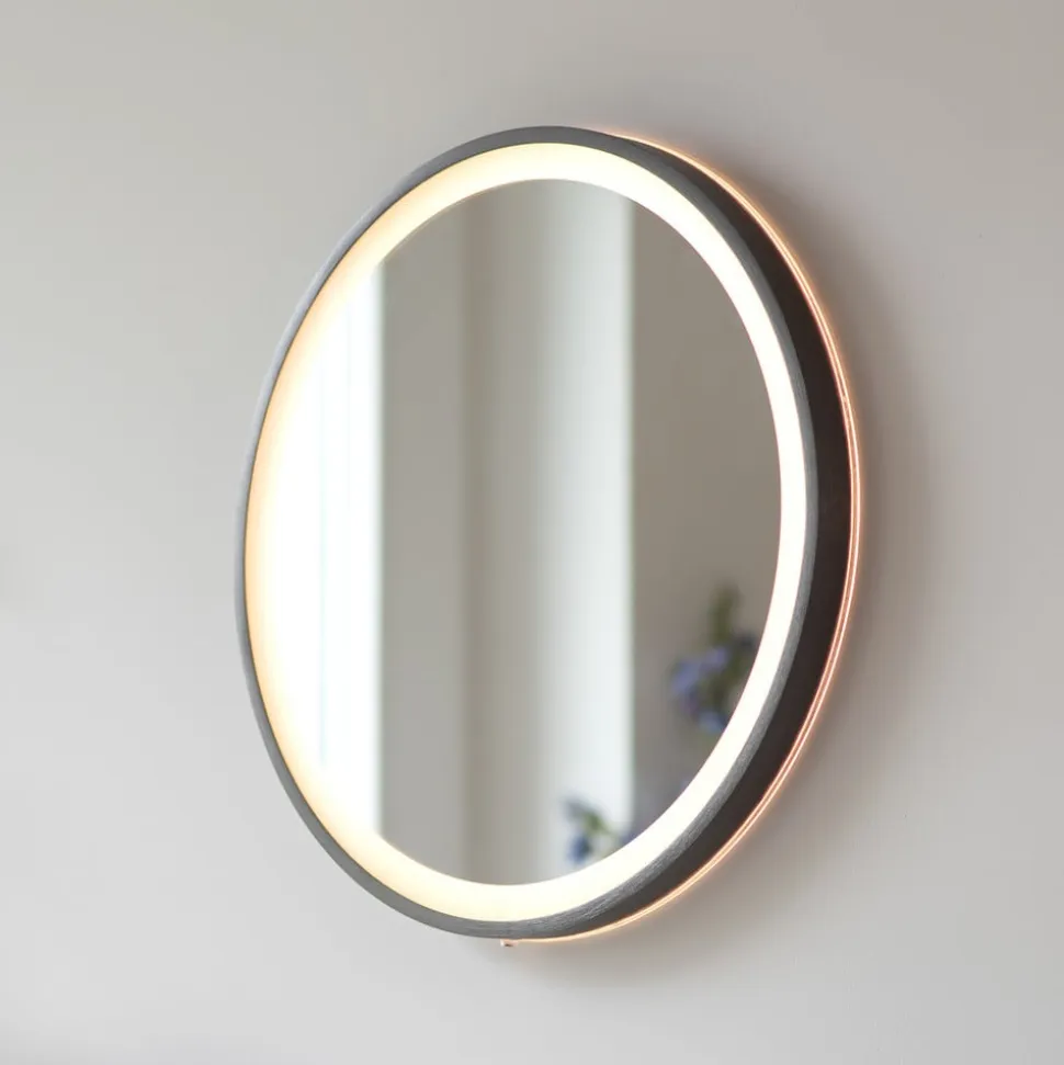 Rundt vægspegel VIDRO med varmhvid LED-belysning og flot baggrundsbelysning