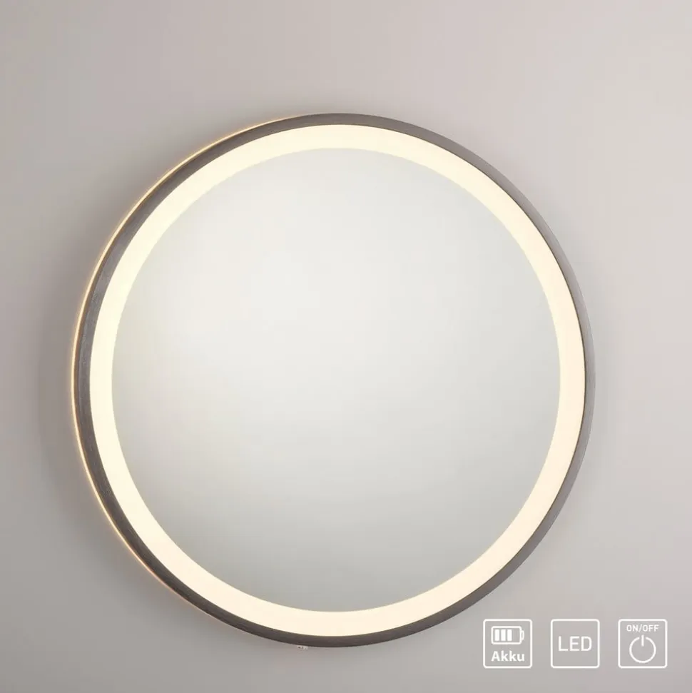 Glasspejlet VIDRO til vægmontering er udstyret med en rund, kontrastfarvet metalramme. Mellem spejlefladen og rammen er der integreret varmhvide LED’er. Lyset fra disse LED’er reflekteres både fremad og bagud mod væggen. Strømforsyningen sker via en medfølgende 5000 mAh powerbank. LED-vægspeglen VIDRO er beregnet til tørre indendørsområder, f.eks. gange, soveværelser og omklædningsrum.