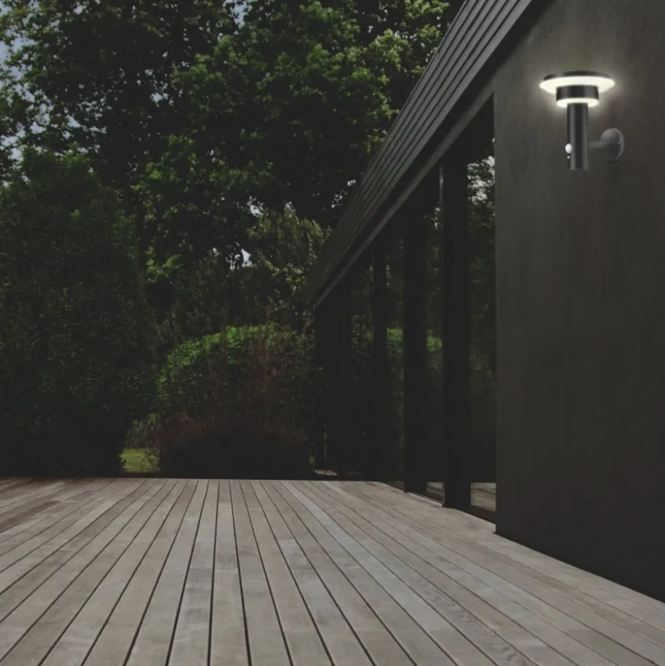Udendørs væglampe med solceller Endura Style Solar Double Circle Endura Style Double Circle væglampe med solceller og integreret sensor kan bruges til at give belysning, hvor der ikke er strømtilslutning til at installere en konventionel væglampe. Det moderne armatur i rustfrit stål giver on-demand-belysning og sparer samtidig energi, da det er udstyret med en bevægelses- og dagslyssensor, så lyset kun tændes, når der er brug for det. Bevægelsessensoren har en detektionsvinkel på 90° og en rækkevidde på 6 meter, tærskelværdien er 10 lux. Armaturet kan indstilles til tre driftstilstande: – Kontinuerligt lys med 200 lumen – Kontinuerligt lys med 75 lumen, skifter til 300 lumen ved bevægelse – Lys slukket, skifter til 400 lumen ved bevægelse Afhængigt af indstillingen er belysningens varighed op til 8 timer, batteriet genoplades af solpanelet på 7 til 8 timer – afhængigt af vejret og armaturets orientering.