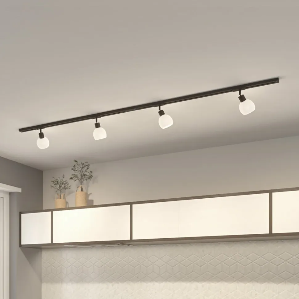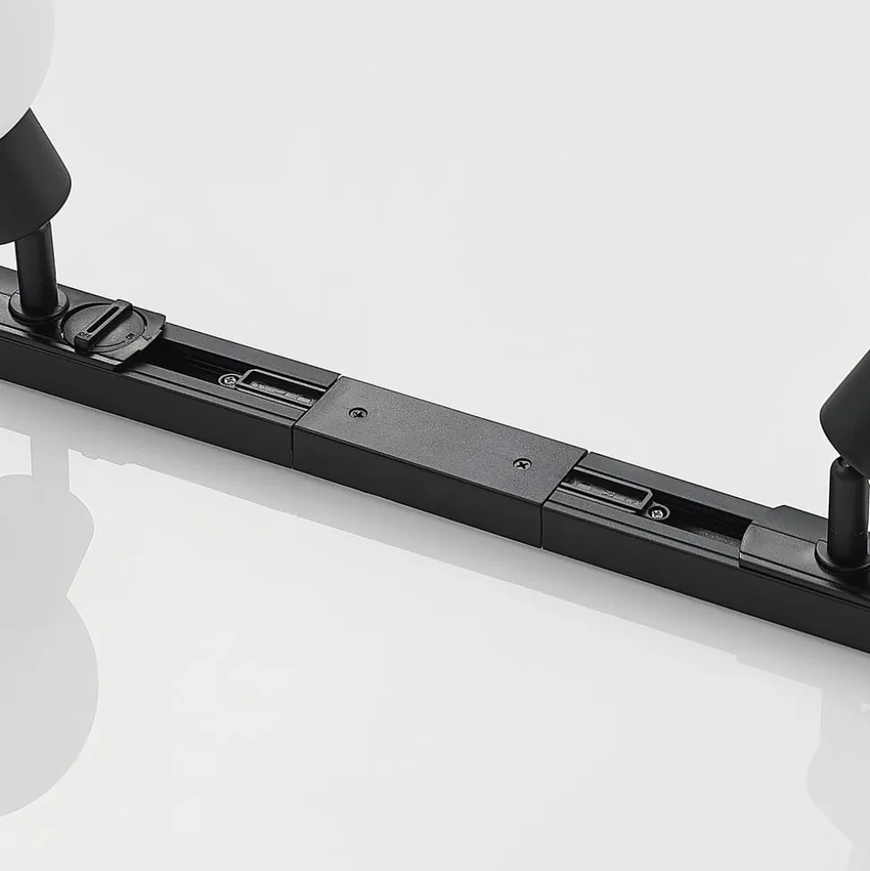 4 lyskilder Linaro 1-fase skinne i sort Denne skinne er udstyret med fire bevægelige spots, der har en attraktiv kugleformet glasskærm, mens rammen og skinnen er udført i sort. Det opalhvide glas skaber et behageligt lys, der er velegnet til mange steder i boligen. 2 x 1 m lang skinne, en centerfeeder, to endestykker og fire spots leveres sammen med denne 1-fase skinne.