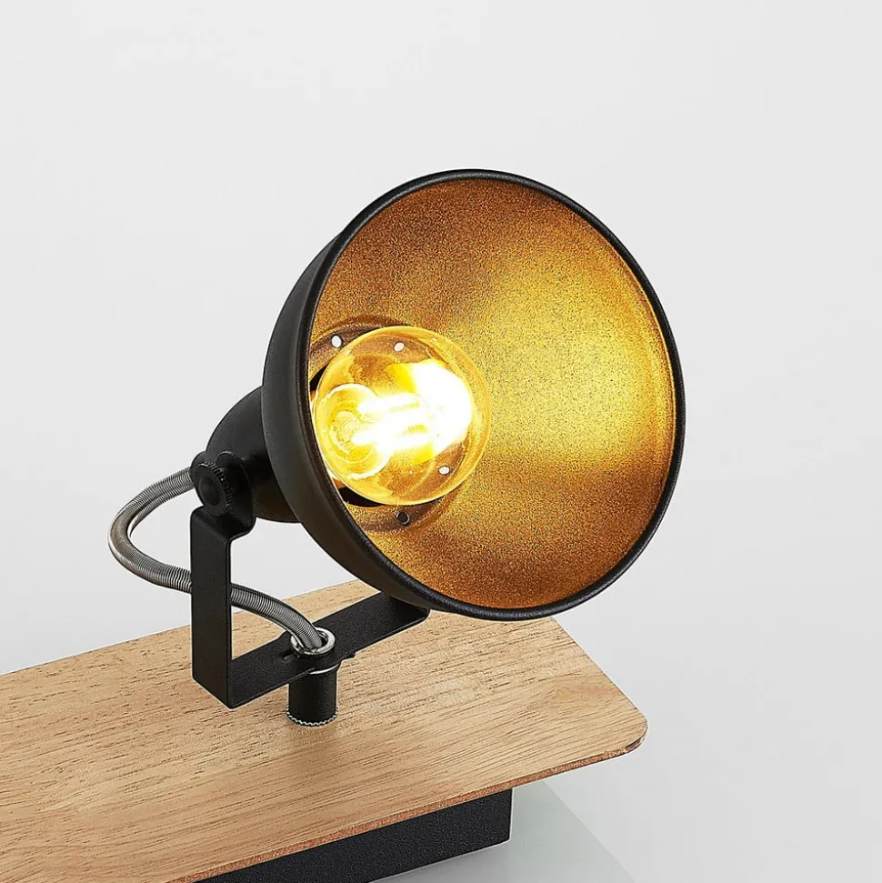 4 lyskilder Aylis med sorte metalskærme og et loftpanel af krydsfiner Aylis er bestemt en loftlampe, der er indbegrebet af den stadig mere populære industrielle stil. Det skyldes først og fremmest metalskærmene med den matsorte overflade og de synlige samlinger og skruer, som ikke kun tjener til at dreje og svinge lampeskærmene, men også til at give armaturet et bestemt look. Loftspladen er dog ikke sort som resten, men lavet af flot krydsfiner med en lys overflade. Det giver et naturligt touch til den industrielle stil, som ganske vist har en kontrasterende effekt, men som ikke mangler en vis harmoni.