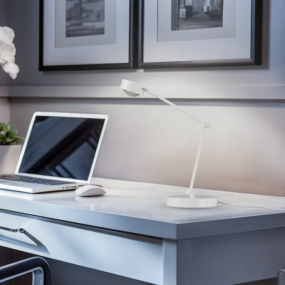 Moderne Jyla-bordlampe af hvidt jern, inkl. GX53-pære medfølger Jyla-bordlampen er ideel til accentbelysning på et bord i stuen eller arbejdsværelset. Den har en diskret karakter, da den har et enkelt udseende og farveskema. Den hvide farve passer nemt ind i enhver indretningsstil. Den medfølgende pære giver et universalhvidt lys, kan dæmpes i tre trin og har en buet linse, så den ligner en glashalvkugle. Lyset kan tændes og slukkes som normalt ved hjælp af en vægkontakt. Takket være 3-trins dæmpningsteknologien med integreret slukfunktion kan den også dæmmes til tre forskellige lysstyrkeniveauer ved at trykke på kontakten flere gange: 100 %, 50 % og 25 %.