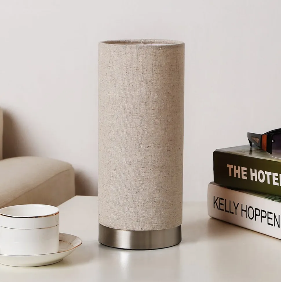 Dæmpbar Ronja stofbordlampe med groft vævet cylinderskærm i en lys cremefarve Næsten enhver husholdning beriges af en lille bordlampe, gerne med en stofskærm. På den måde kan man skabe et rigtig hyggeligt lys, som får rummet til at fremstå rigtig behageligt. Det gælder selvfølgelig også for bordlampen Ronja, som har en groft vævet skærm med en lys, cremefarvet overflade, mens den runde fod, som støder direkte op til skærmen, har en mat nikkelfinish. Hvad man ikke ser ved første øjekast, er, at foden har endnu mere at byde på, da den huser 3-trins touchdæmperen. Konkret betyder det, at en enkelt berøring tænder lyskilden på det laveste lysstyrkeniveau, og at lysstyrken øges, så snart du berører den runde base en anden og en tredje gang. Endnu en berøring slukker bordlampen i stof igen. Hvis man er klar over funktionerne i Ronja, som også har relativt kompakte dimensioner, vil man hurtigt indse, at bordlampen i stof er et vidunderligt belysningsobjekt til natbordet ved siden af sengen.