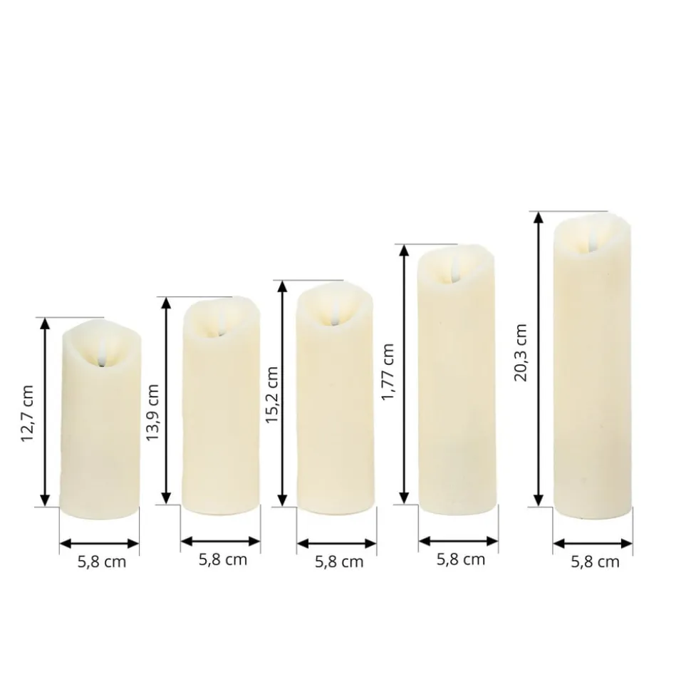 kerte 1 – Ø 5,6 cm, højde 12,7 cm; kerte 2 – Ø 5,6 cm, højde 14 cm; kerte 3 – Ø 5,6 cm, højde 15,2 cm; kerte 4 – Ø 5,6 cm, højde 17,8 cm; kerte 5 – Ø 5,6 cm, højde 20,3 cm