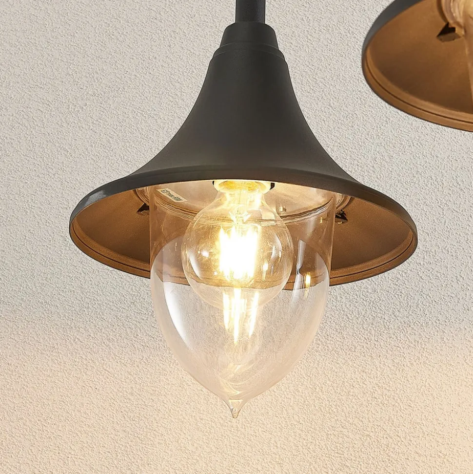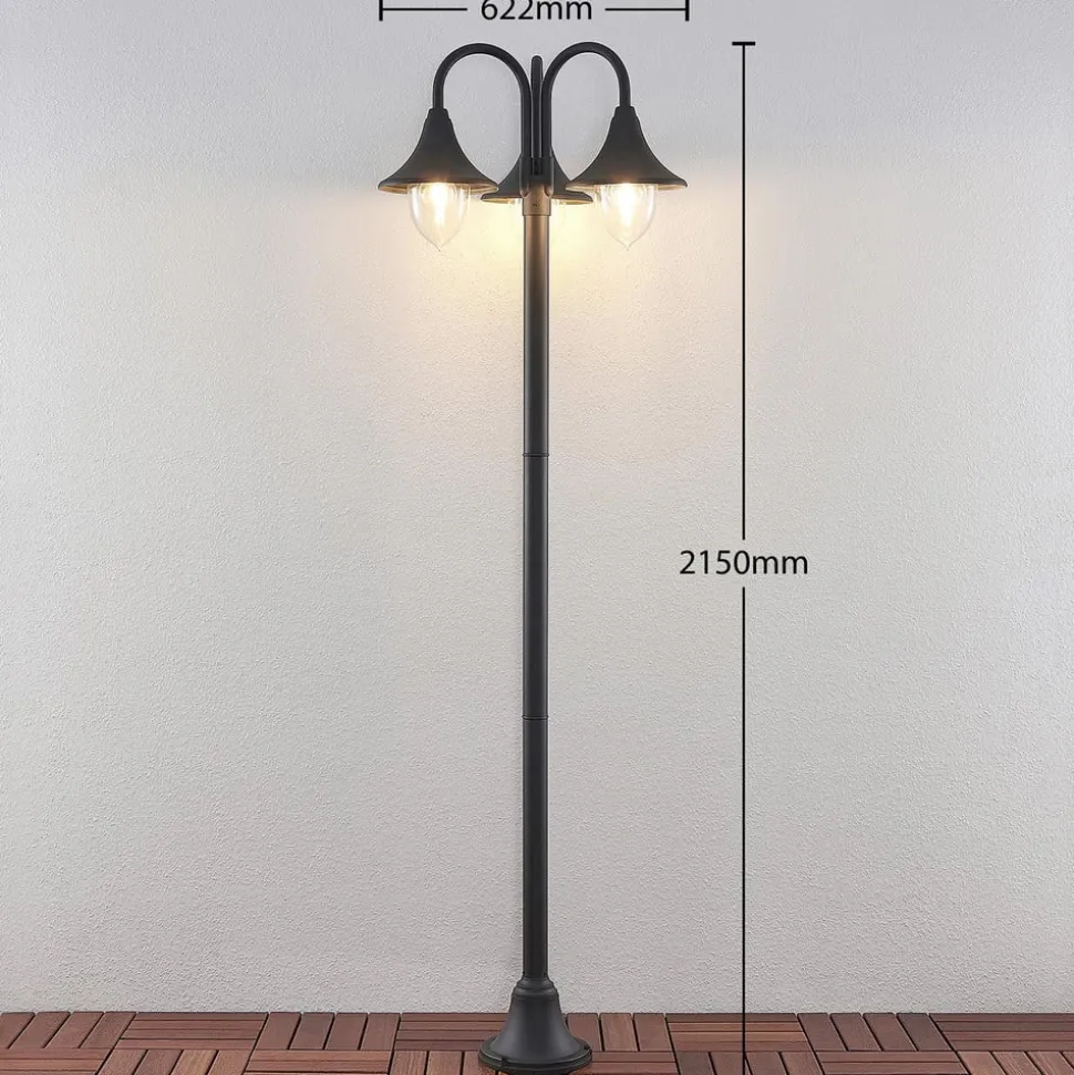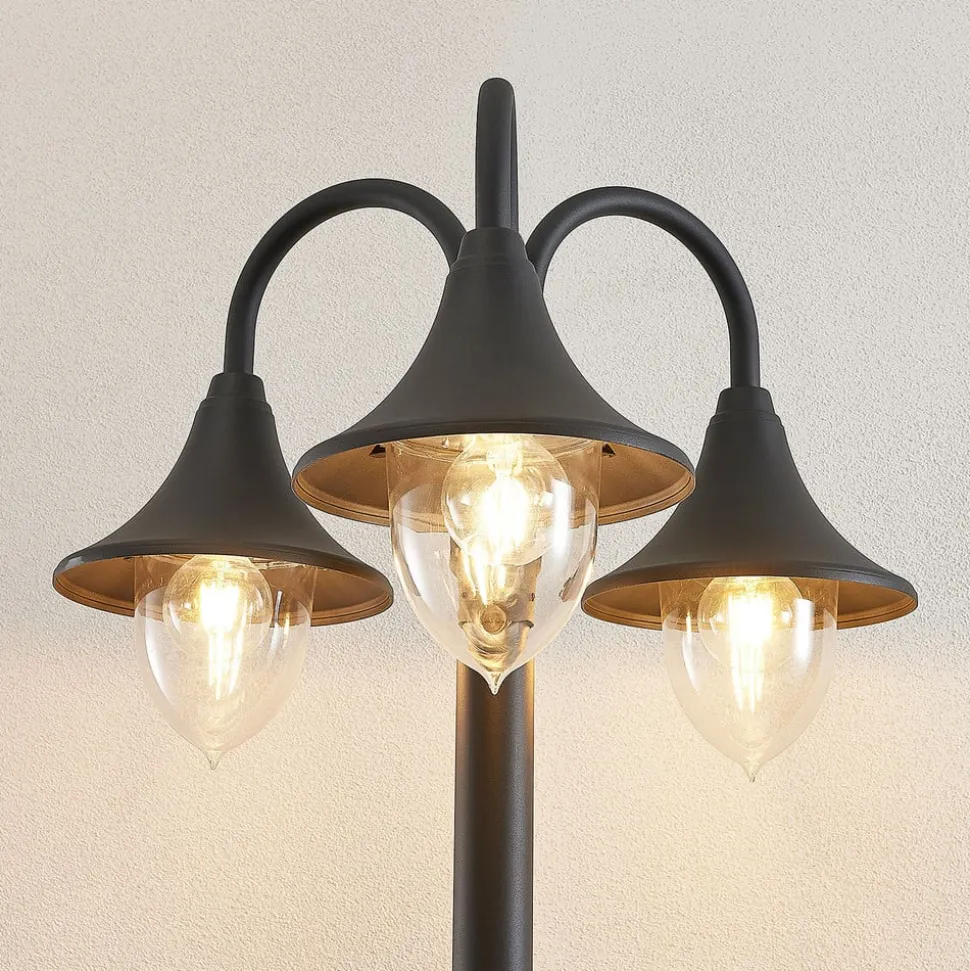 Edric lygtepæl med 3 lyskilder og nostalgisk flair Edric lygtepælen er med sit nostalgiske, antikke design meget attraktiv at se på og giver ikke kun pålidelig belysning om aftenen, men er også et ægte blikfang om dagen. Edric bruges på parkeringspladser, i indkørsler eller i haven og oplyser pålideligt omgivelserne med sine tre lyskilder. Edric kan endda installeres og bruges i nærheden af havet, da lygtepælen er saltvandsresistent. Rammen er lavet af aluminium, og de tre lyskilder er desuden beskyttet af en gennemsigtig skærm af klar plast.