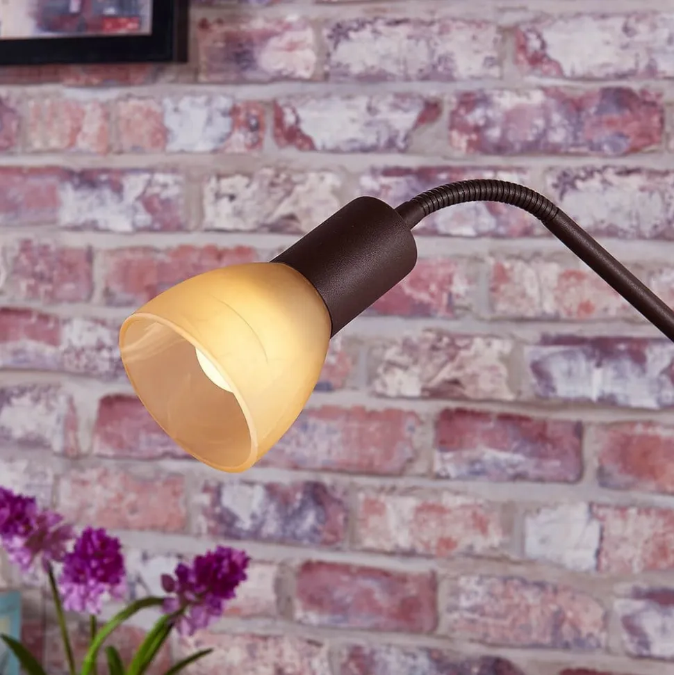 Felicia rustbrun uplight med integreret læselampe Felicia har et særligt rustikt look som uplight. Det skyldes selvfølgelig først og fremmest farvesammensætningen, da rammen på uplighten er rustfarvet, og de to glas er en smuk ravfarvet nuance med et alabastfarvet skær. Det sikrer, at lyset er varmt, særligt hyggeligt og velegnet til en afslappende aften. Uplighten imponerer med sit indirekte lys, og læselampen er ansvarlig for det målrettede lys. Selv om det kun er meget lokalt, er det tilstrækkeligt til læsning og aflastning af øjnene, når man tager en bog eller et magasin op.
