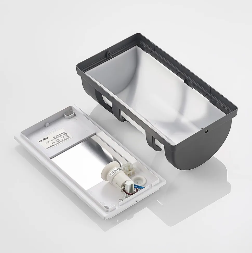 Dens hus er lavet af aluminium og får en mørkegrå finish. Lampeskærmen beskytter E27- fatning bagved og er lavet af opalhvid plast. Dette har den bivirkning, at skærmen fungerer som en diffusor og gør det muligt at distribuere lyset jævnt.