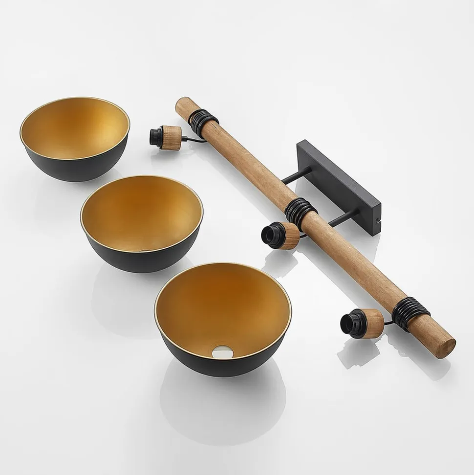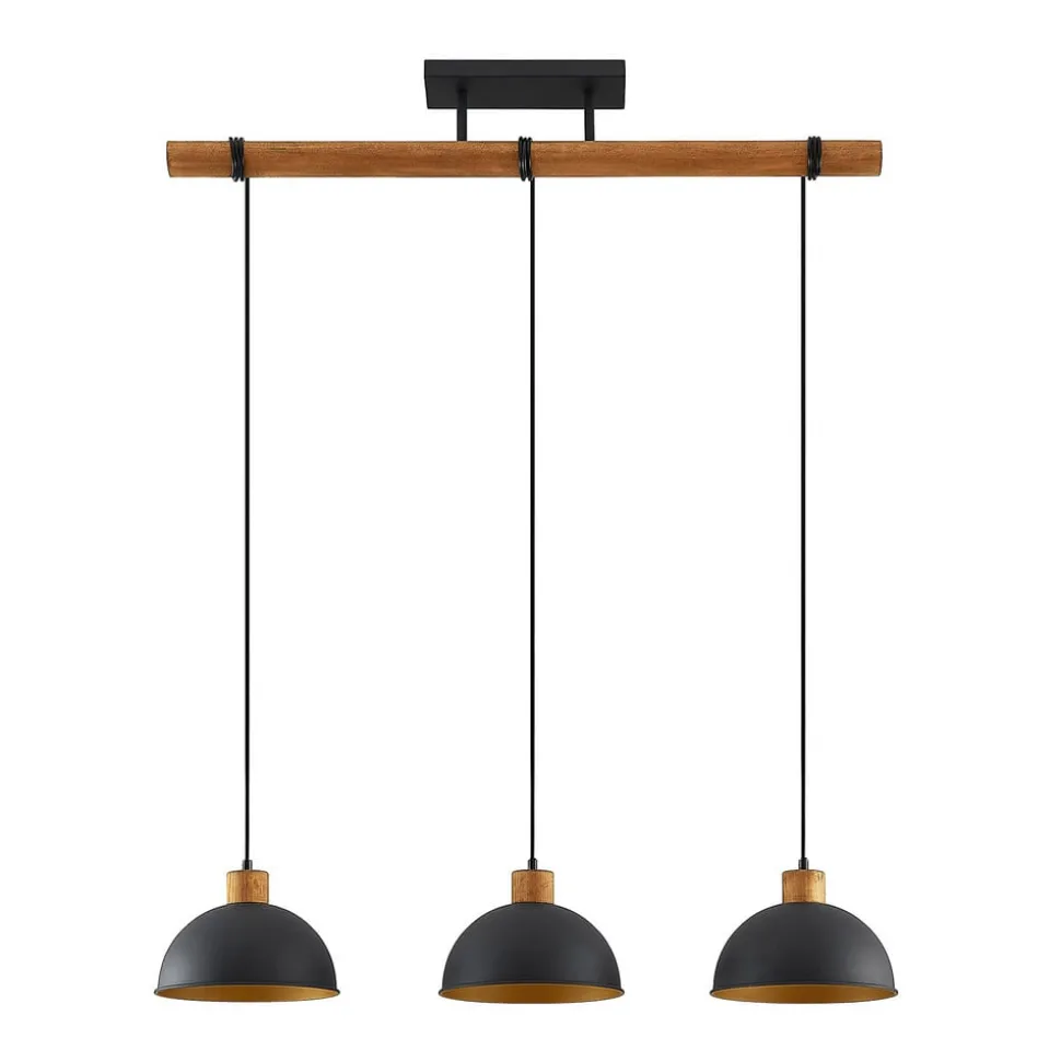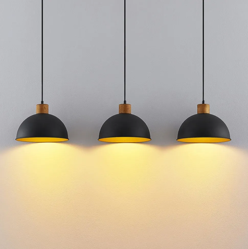 Flurin 3 lyskilder hængelampe i et robust design af jern og gummitræ Flurin hængelampen kombinerer en robust karakter med en hyggelig farvekombination. Lampeskærmene er lavet af jern og har et sandsort ydre, mens deres indre vægge fremstår i en slående guldfarve. Der er plads til en E27-pære inde i hver skærm, som giver den nødvendige belysning. Lyset dæmpes smukt gennem åbningen på undersiden, hvilket gør den perfekt til at oplyse et langt spisebord. Den passer godt ind i mange forskellige indretningsstile og gør ethvert rum til noget helt særligt.