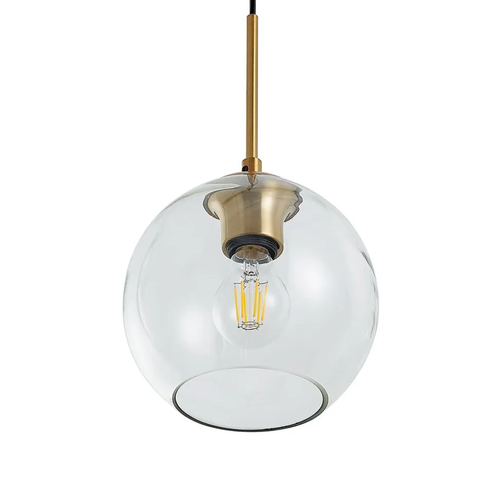 3 lyskilder Grady pendellampe med klare glasskærme og ståldetaljer i messingfinish Glasskærmene på denne pendellampe er kugleformede og har en meget klar overflade, så lyset kan trænge uhindret udad, og intet af lysstyrken går tabt. De suppleres af elementer med messingfinish, som er tydeligt synlige gennem det klare glas og effektivt supplerer det overordnede design. Pærerne er også en synlig del af looket og bør derfor vælges, så de matcher og ser dekorative ud, som det især er tilfældet med LED-filamentpærer, hvis glaskolber minder om de velkendte glødepærer. Glasdesignet og de runde kugler passer også godt til vintage indretningsstile, og hængelampen gør en førsteklasses figur over et spisebord eller en disk. Lyset er klart og spotlight og kan få et mere hyggeligt præg af lamper med en særlig varm lysfarve.