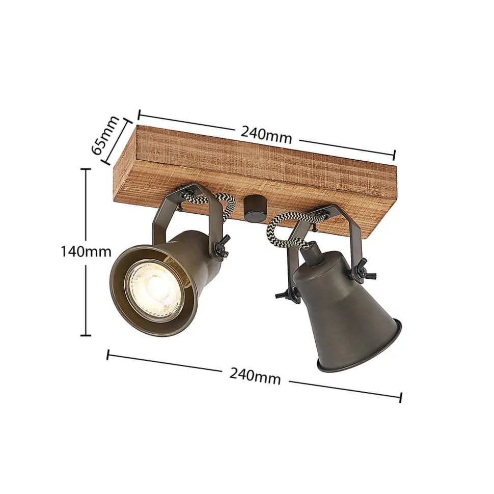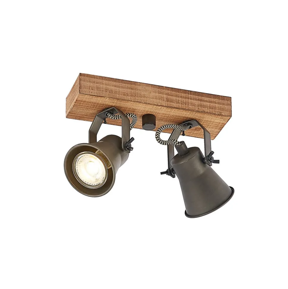 Det træ baldakin af Grandesa loftlampe er udstyret med to projektører. Disse sidder i beslagsholdere, som de kan drejes med og drejes for at lede lysstrålingen ind i et bestemt område. Kombinationen af træ i et flammet look og sortlakeret metal gør spotlighten til en lyskilde i et vintage design, der kan bruges på mange måder.