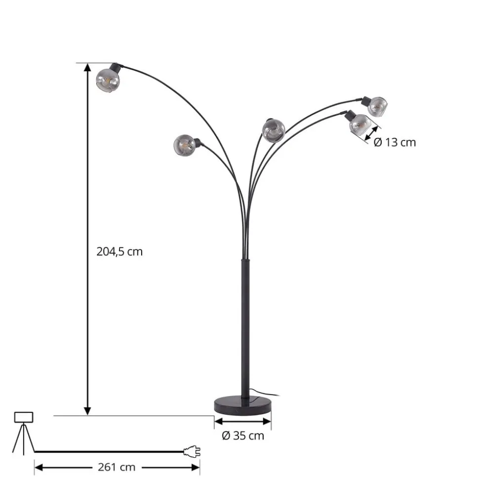 Lindby gulvlampe Braccio, grå/sort, glas, 5 lyskilder, 204,5 cm