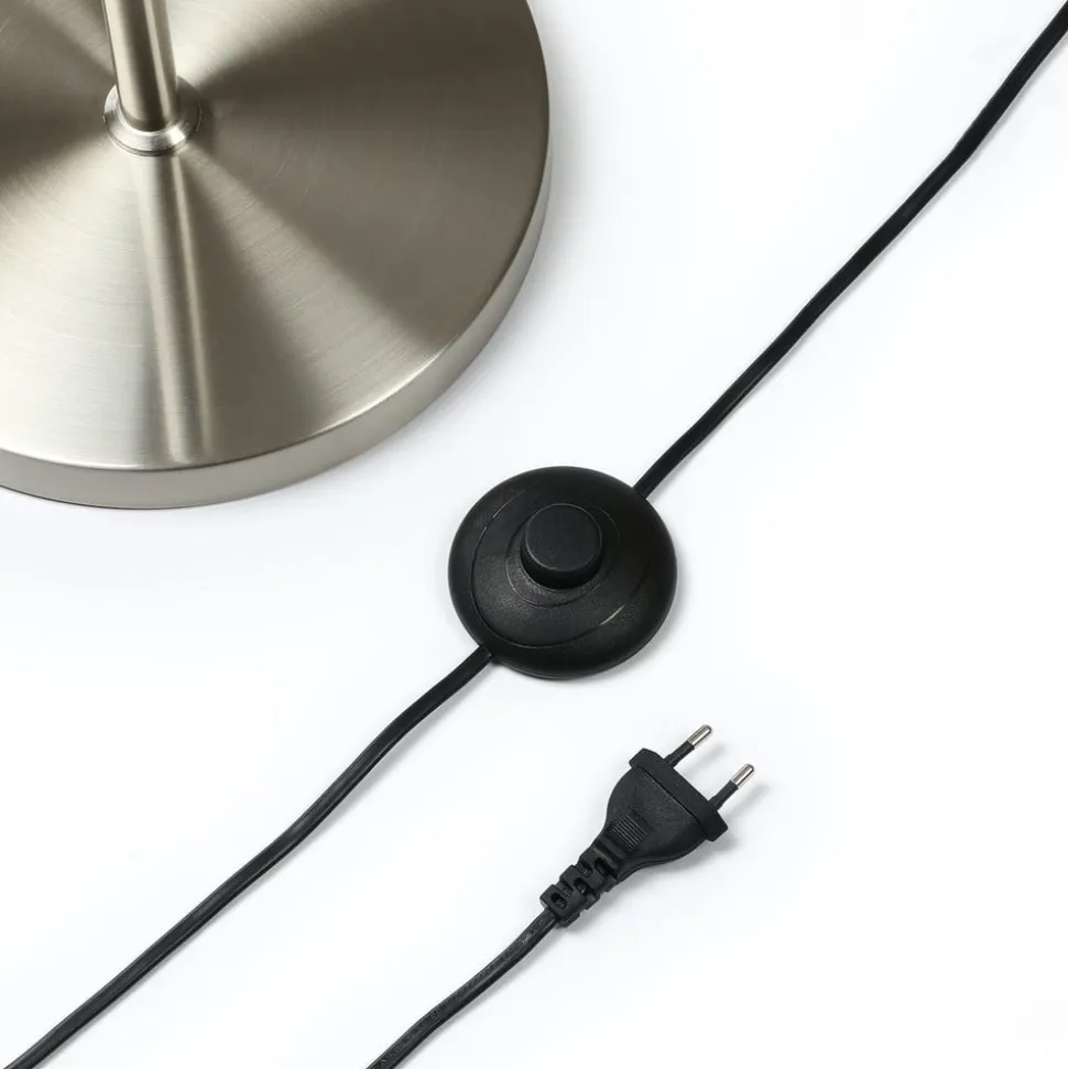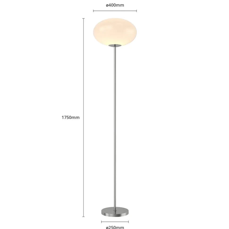 Elegant Sonika gulvlampe med rund lampeskærm Sonika gulvlampen imponerer med sit designorienterede og puristiske look. Stellet har en nikkelfinish og er slankt. Nederst slutter armaturet med en rund base. Takket være den fremspringende lampeskærm af opalglas skabes der en smuk og harmonisk kontrast, der straks fanger øjet. Det matterede glas har den fordel, at lyset kan udsendes jævnt i alle retninger uden at blænde beskueren. Sonika er derfor ideel som stilfuld accentbelysning i stuen. Udstyret med en fodkontakt er armaturet let at betjene og kan bruges med en E27-pære.