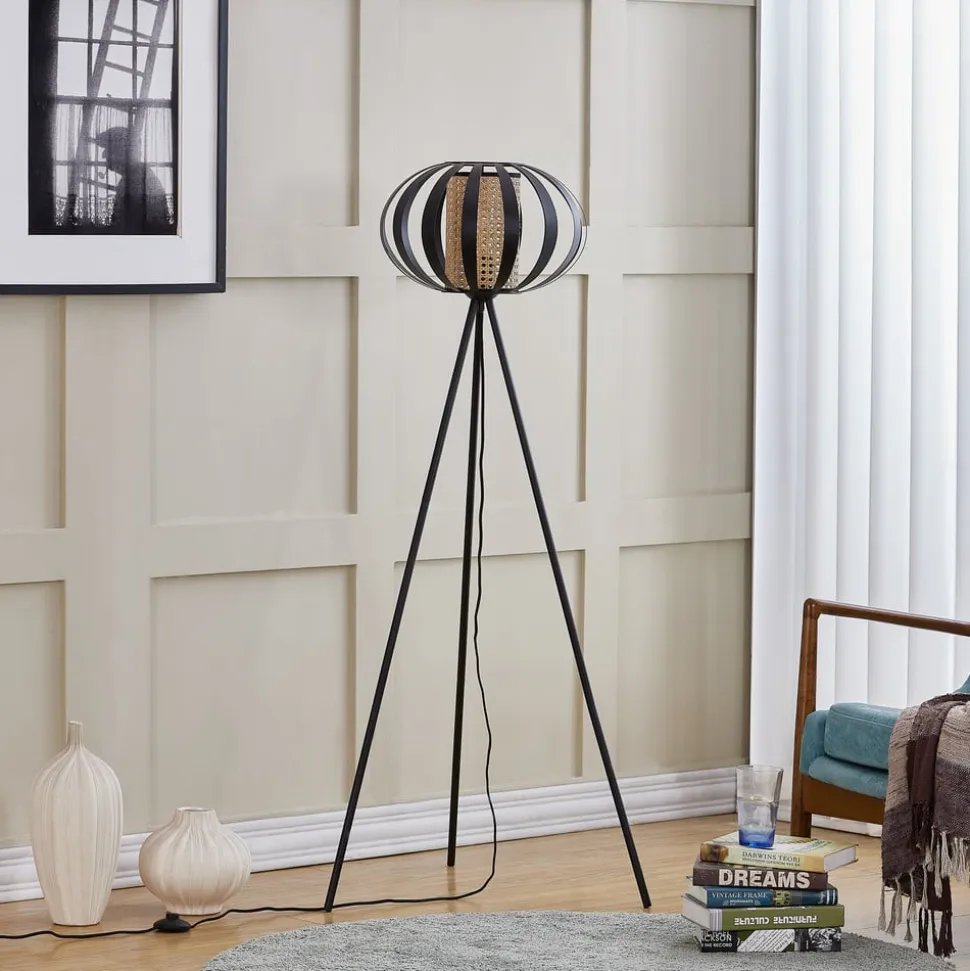 Tamira gulvlampe af metal og rattan – det rustikke stativ til indendørs brug Denne gulvlampe sætter dekorative lysaccenter i din indretning. Lampen er nem at betjene ved hjælp af en kontakt på kablet. Den har en smuk stil og passer smukt ind i ethvert område. Den smukke gulvlampe har et tidløst design og giver dit hjem en fantastisk atmosfære. Gulvlampen er udstyret med en E27-fatning. Den fås i farverne sort og træ. Vælg fremragende kvalitet fra Lindby-mærket med denne gulvlampe. Dit interiør vil blive beriget af gulvlampen, som hurtigt har fundet det rigtige sted. Giv den perfekte belysning i dit hjem med denne lampe.