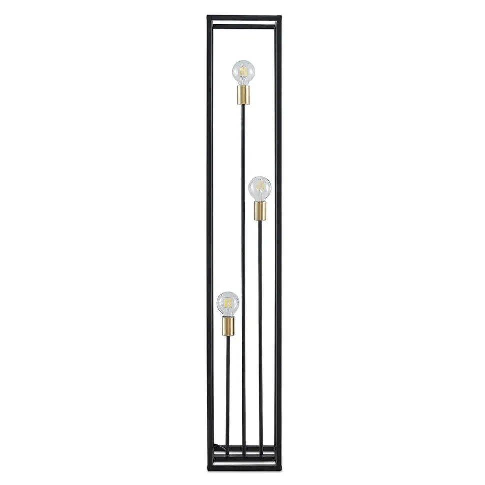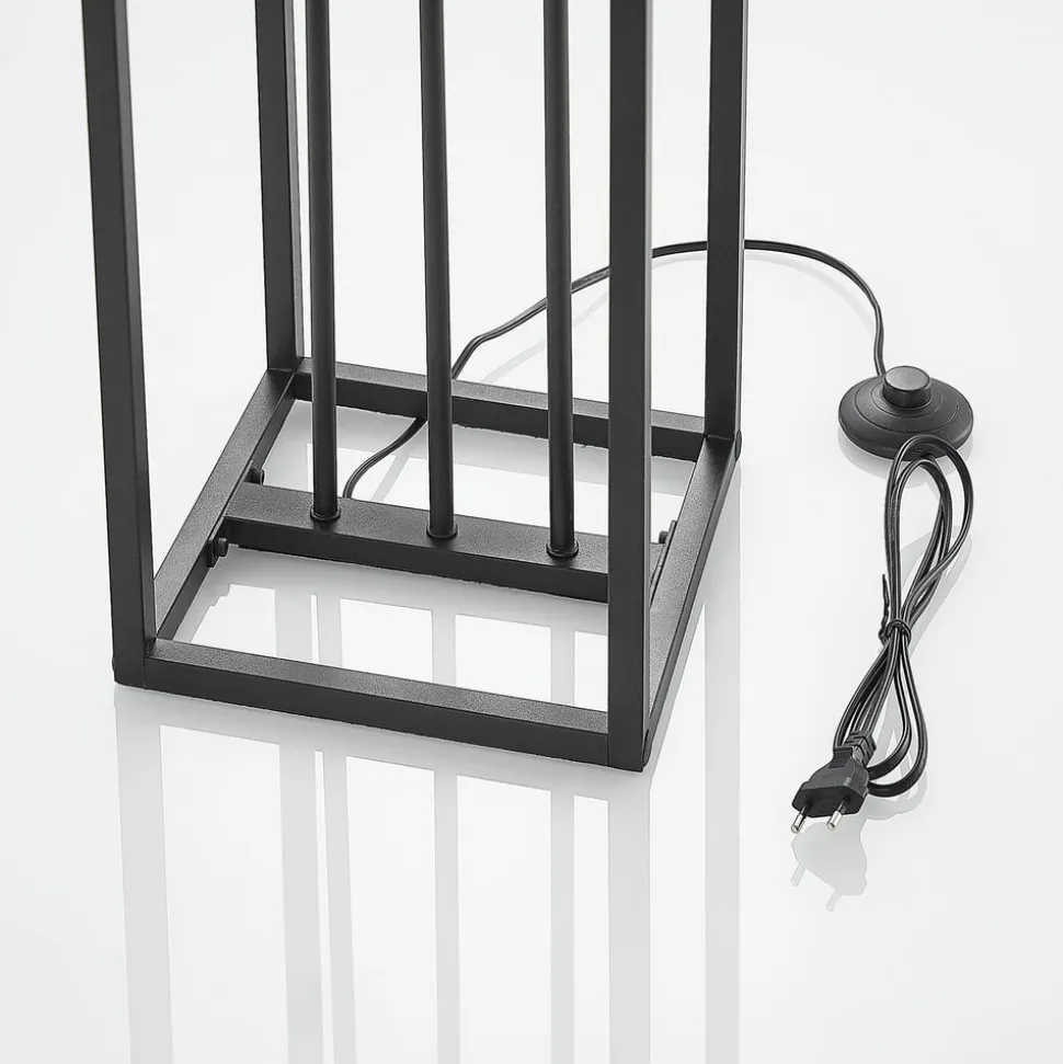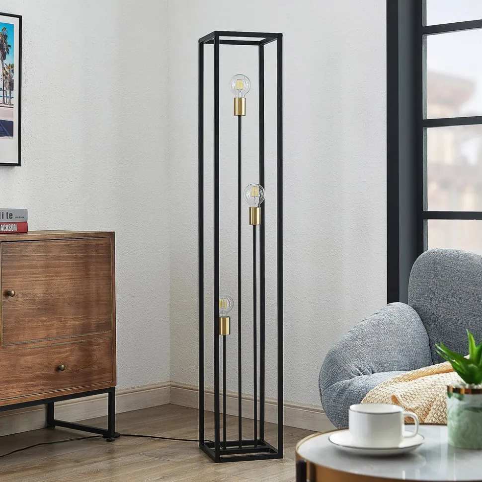 Kasseformet Tiliano-gulvlampe med tre frit synlige E27-lyskilder Tiliano-gulvlampen er absolut et seværdigt belysningsobjekt, som ikke har meget til fælles med klassiske repræsentanter af sin art og i stedet repræsenterer en moderne og designorienteret belysningsløsning til opholdsrum. I stedet for skærme er der et rammeformet metalelement af matsort jern, som har form som en kube og er helt åbent på alle sider. Inde i strukturen er der tre stænger, også sorte, som ender i forskellige højder og hver især går over i en E27-fatning. Lamper kan vælges efter ønske, men på grund af deres gode synlighed og mærkbare bidrag til det overordnede look bør de ikke kun vælges ud fra tekniske aspekter, men også med henblik på deres udseende. Glødelamper eller rustikke lyspærer, som også fås med effektiv LED-teknologi, er særligt velegnede, fordi deres udseende efterligner klassiske gløde- eller kulstoflamper. En fantastisk gulvlampe til et iøjnefaldende look i hele boligområdet, som passer godt til moderne interiør med sine lige linjer, men som også kan supplere visse vintage- og Scandi-stilarter meget godt!