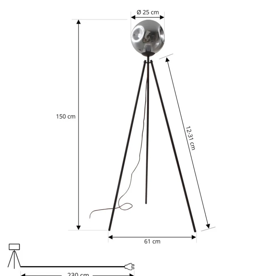 Valentina gulvlampe med glasskærm i røgfarvet grå Valentina er en moderne gulvlampe, der består af et brunt jernstel og en røgfarvet grå glasskærm. Skærmen er ikke helt afrundet og har en konkav form. Den har dekorative fordybninger, som gør den til et særligt blikfang, selv når den er slukket. Lyset kommer hele vejen rundt og skaber en hyggelig atmosfære. Da lyskilden er fuldt synlig, er det ideelt at bruge en dekorativ lampe. Valentina tændes og slukkes ved hjælp af en fodkontakt. Gulvlampen kan f.eks. bruges som lyskilde i stuen.