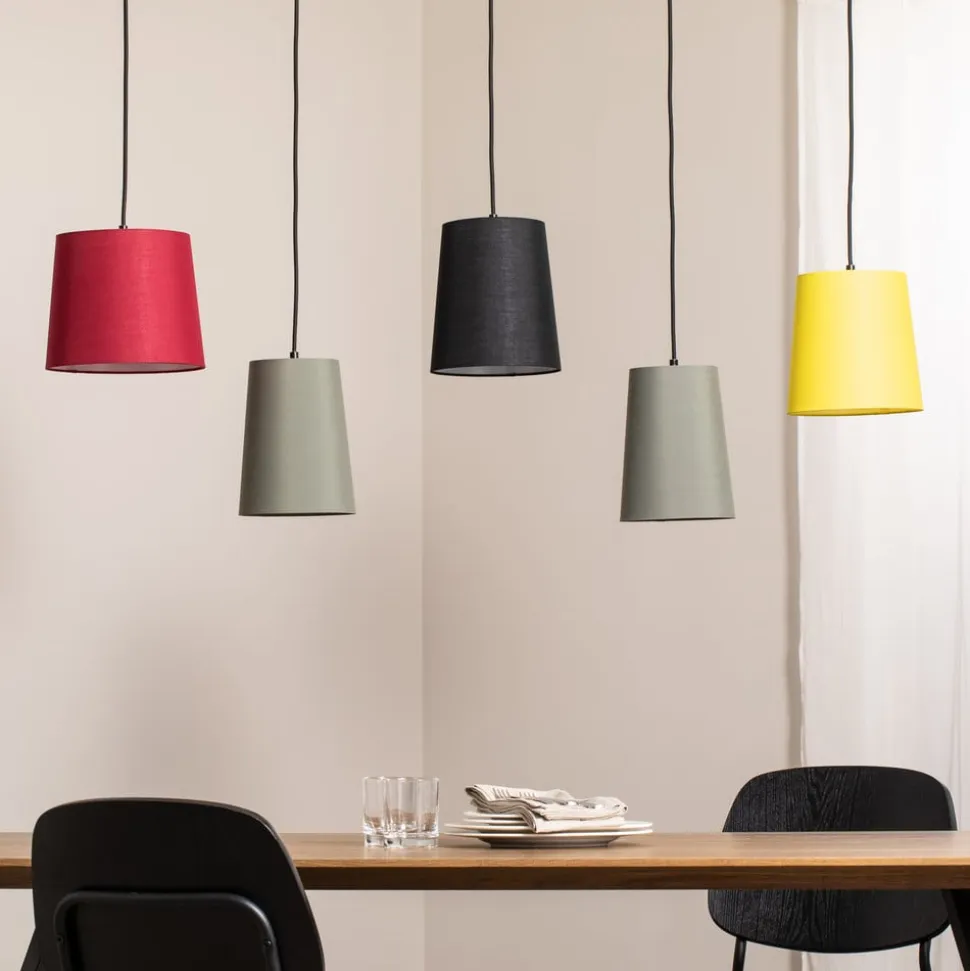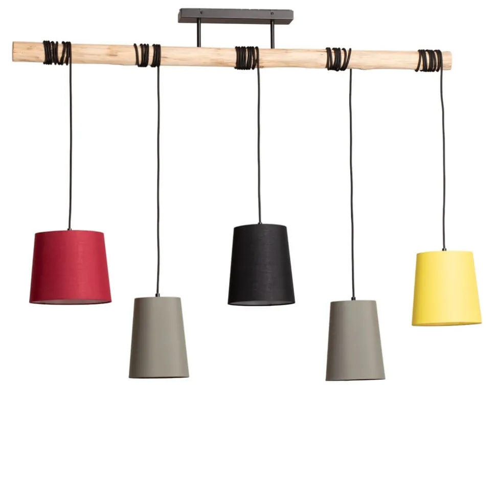 Pendellampen Amilia er en iøjnefaldende lyskilde over spisebordet eller i sofakrogen takket være de fem farverige lampeskærme i tekstil, der fås i rød, sort, grå og gul. Disse hænger ned fra en træstang med tekstilbeklædte kabler, hvor ophænget kan varieres ved at vikle kablerne omkring træet. Den farverige lampe bringer liv i rummet og sørger for en behagelig belysning, da lampeskærmene dæmper lyset, men lader det strømme uhindret ned gennem åbningen, så bordet bliver behageligt oplyst.