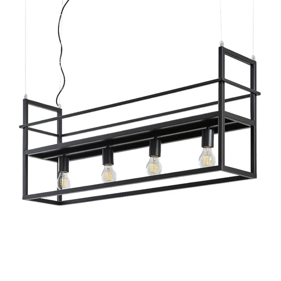 Grisela metalpendel i sort med smuk ophængning Den 4 lyskilder store Grisela hængelampe er ikke bare en lyskilde, men også en hængende hylde, hvor mindre dekorative genstande kan udstilles. Den passer både i en moderne spisestue og i køkkenet over en kogeø eller et køkkenbord og kan f.eks. udstyres med små urtepotter eller krydderikrukker. Lampens ramme er lavet af matsort lakeret stål, som i kombination med det lineære design skaber et moderne look. Ophænget i fire stålkabler forstærker det moderne præg. Grisela-pendlen leveres med to ophængssæt – et i sort og et i transparent. Lampen er udstyret med fire E27-fatninger, der vender nedad, og hvor pærerne er frit synlige. Et meget attraktivt look skabes, når der vælges dekorative lyskilder – for eksempel energieffektive og langtidsholdbare LED-pærer med klart eller let tonet glas og glødetrådslook.