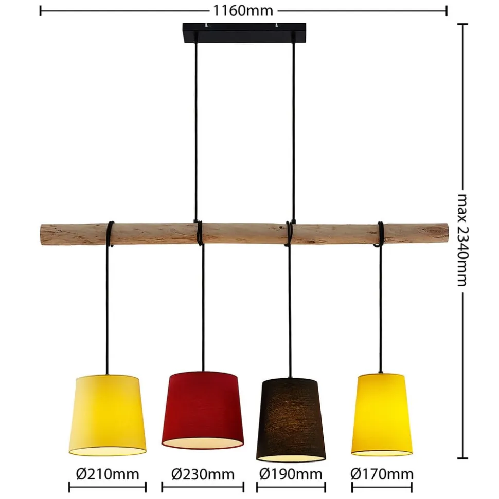 Hinai hængelampe med farvede lampeskærme og en træbjælke Hinai er en særlig hængelampe, der ser godt ud over et spisebord eller en disk. Den består af en lang bjælke af eukalyptustræ, hvorom der er viklet fire tekstilkabler. Højden på ophænget kan justeres efter behov. De cylindriske lampeskærme fås i forskellige lyse farver og bringer en munter stemning ind i stuen.
