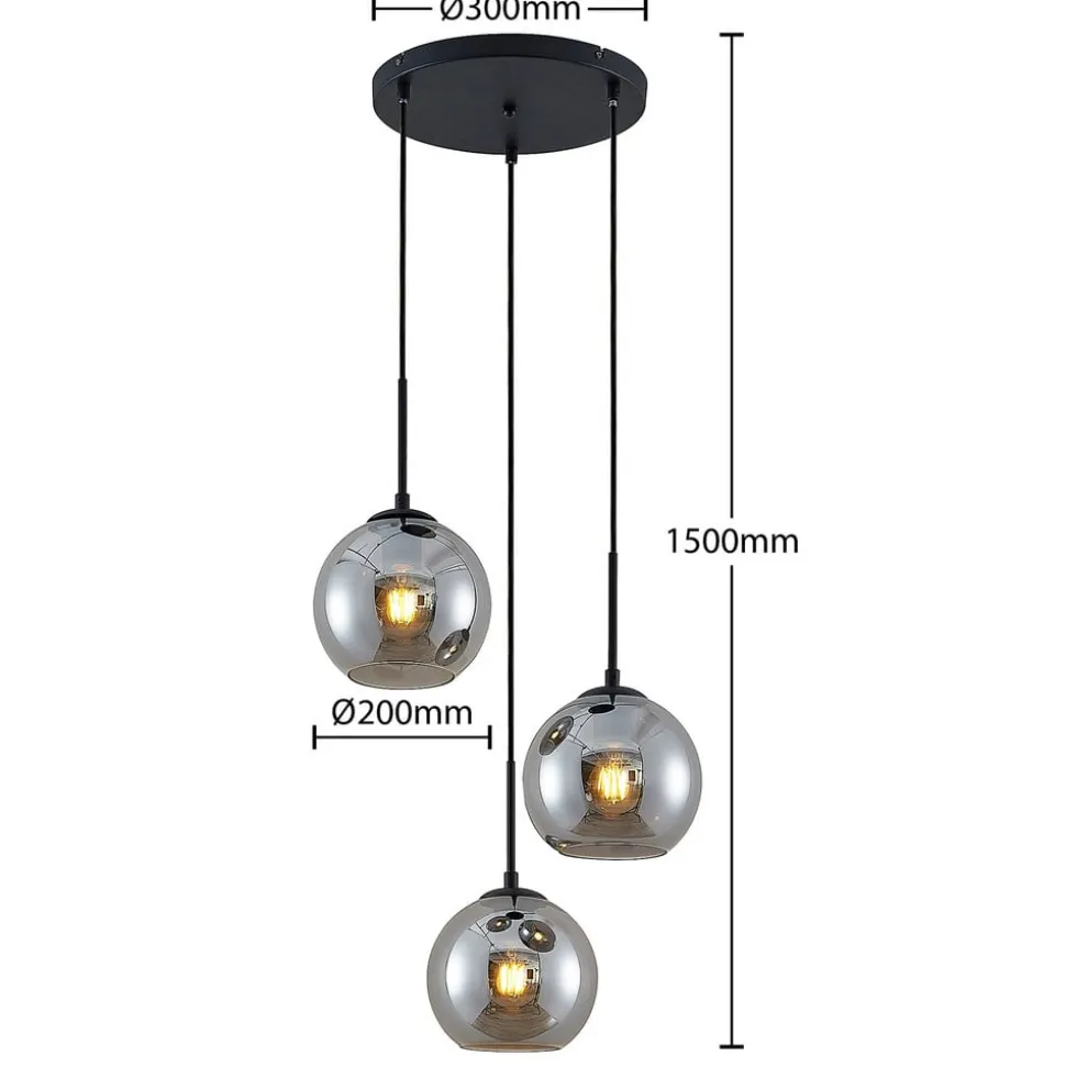 3 lyskilder Jurian hængelampe med røgfarvede glasskærme og detaljer i sort Jurian hængelampen er en smuk lyskilde til stuen, som kan monteres smukt over en spisestue eller et sofabord og har sfæriske glasskærme, der er tonet røgfarvet grå og suppleres af elementer i messing. Lysmønstret er varmt og indbydende, og pærerne indeni er tydeligt synlige, så lamperne skal se dekorative ud og passe godt ind visuelt. Skærmene hænger ned i forskellige højder for at give et blødt udtryk, og designet kan også kombineres godt med vintagemøbler.