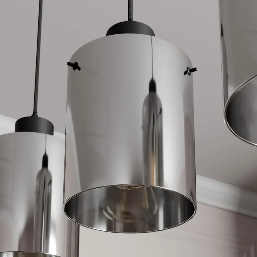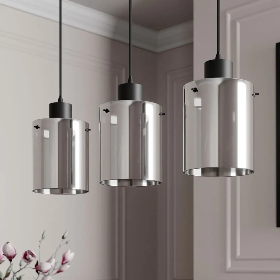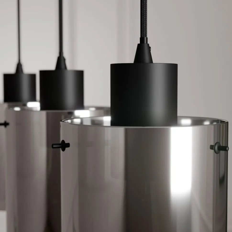 Kourtney 3 lyskilder hængelampe imponerer med sit smukke røget grå glas Kourtney hængelampen imponerer med sine tre lampeskærme i et trendy røget glaslook. Røget grå beskriver den attraktive farve på glasset. Looket har fået sit navn fra det faktum, at glasset ser ud til at være misfarvet af den røgfyldte flamme fra et stearinlys. Det mørke glas sikrer, at lyset skinner blidt igennem. Det betyder, at lyset ikke skinner så kraftigt og ikke blænder. Derfor egner Kourtney sig godt som pendellampe i rum, hvor der er brug for hygge. Lampen gør en særlig fin figur i en stue eller spisestue, især fordi den aflange form gør, at den kan monteres over et bord.
