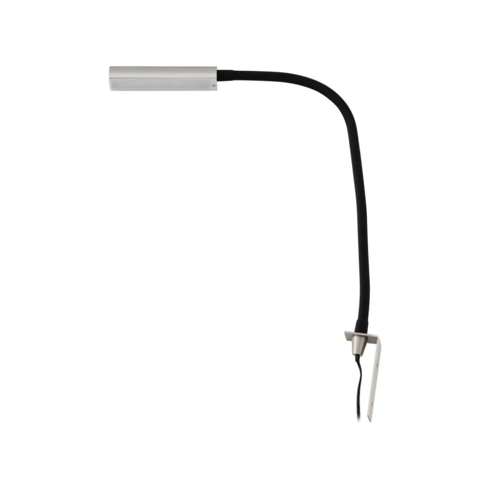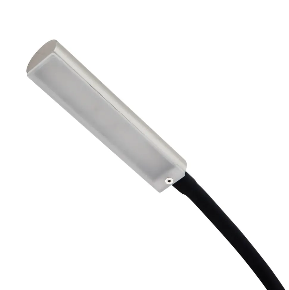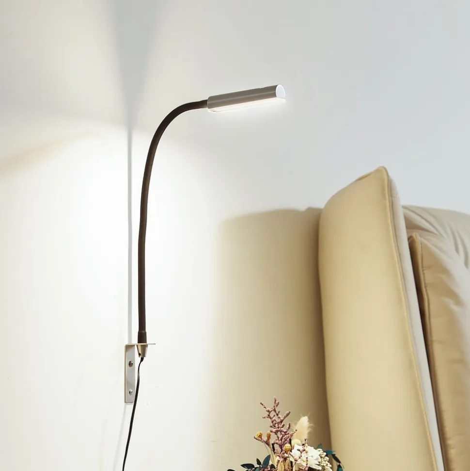 Dæmpbar Flexola LED-læselampe med kantet hoved Det diskrete, nikkelfarvede hoved på Flexola LED-læselampen har en kantet form og kan justeres i alle retninger takket være det fleksible flexrør. Da lyset fungerer ved hjælp af bevægelseskontrol, kan det nemt tændes og slukkes og dæmper på stedet, hvilket gør det ideelt som væglampe ved siden af sengen. Den er forbundet med et kabel og et stik, hvilket gør den nem at placere. Vægbeslaget er meget kompakt – Uendeligt dæmpbar