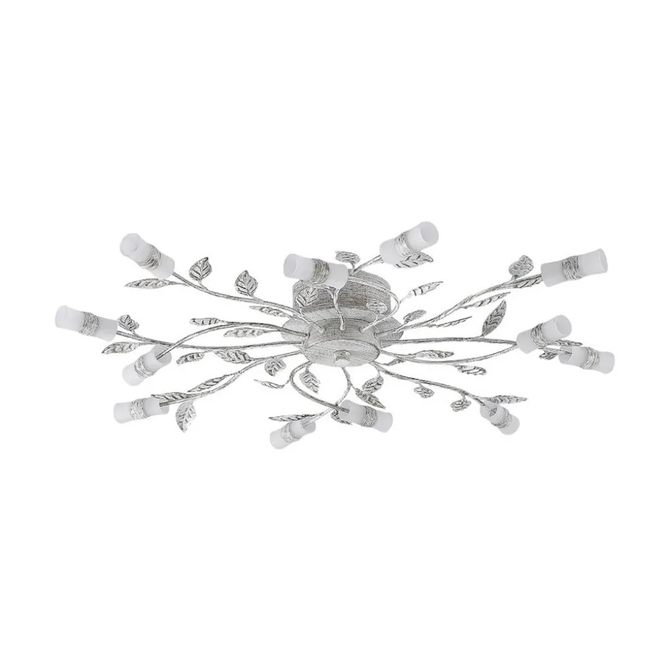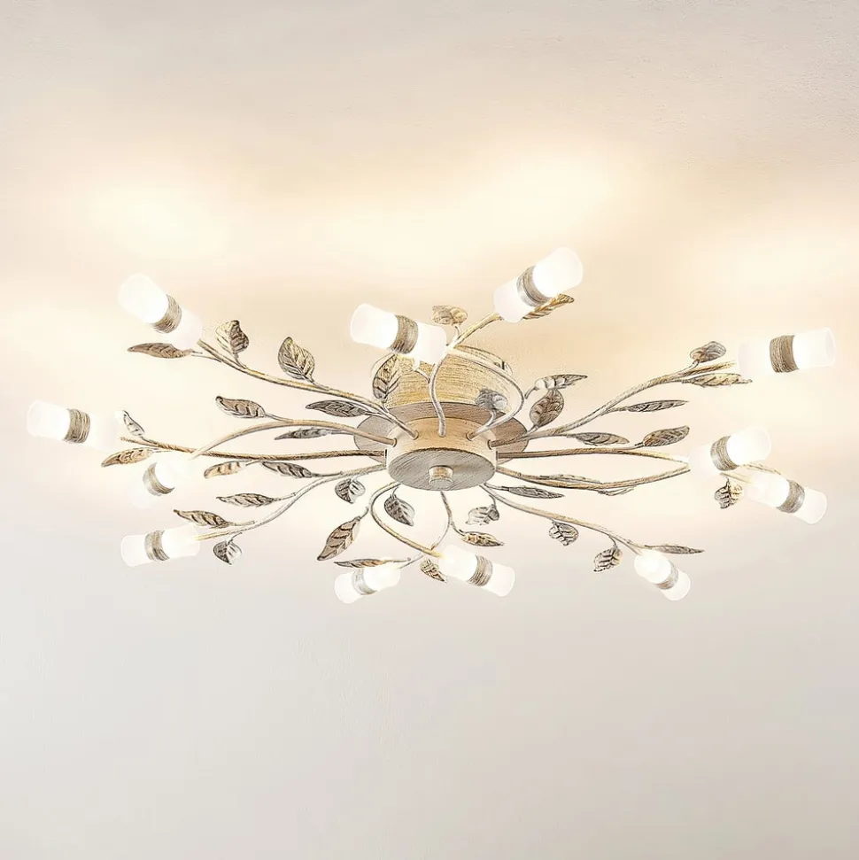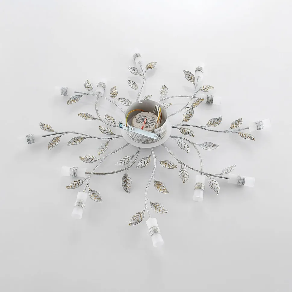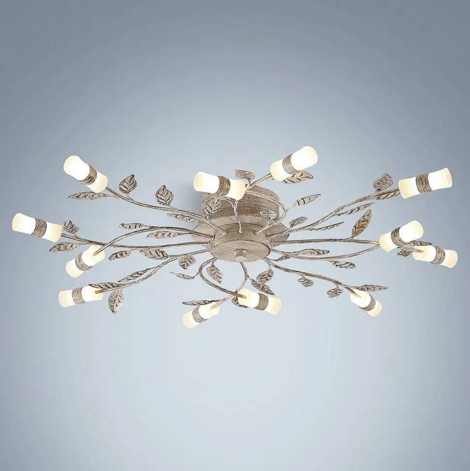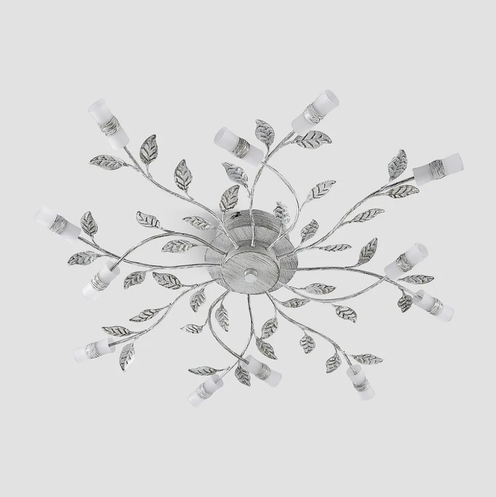 Bolonia LED-loftlampe med blomsterelementer LED-loftlampen Bolonia imponerer med sit yndefulde design. Armaturet består af tolv lampearme, der finder vej ind i rummet. Hver lampearm ligner en enkelt blomst, der ønsker at fylde rummet med sin pragt. Grunden til dette er de filigrane blade, der dekorerer armaturet. Samtidig ser lampeskærmene af glas ud som individuelle blomster. Dette fuldender visuelt armaturet og skaber en vidunderlig blomsterkrans.